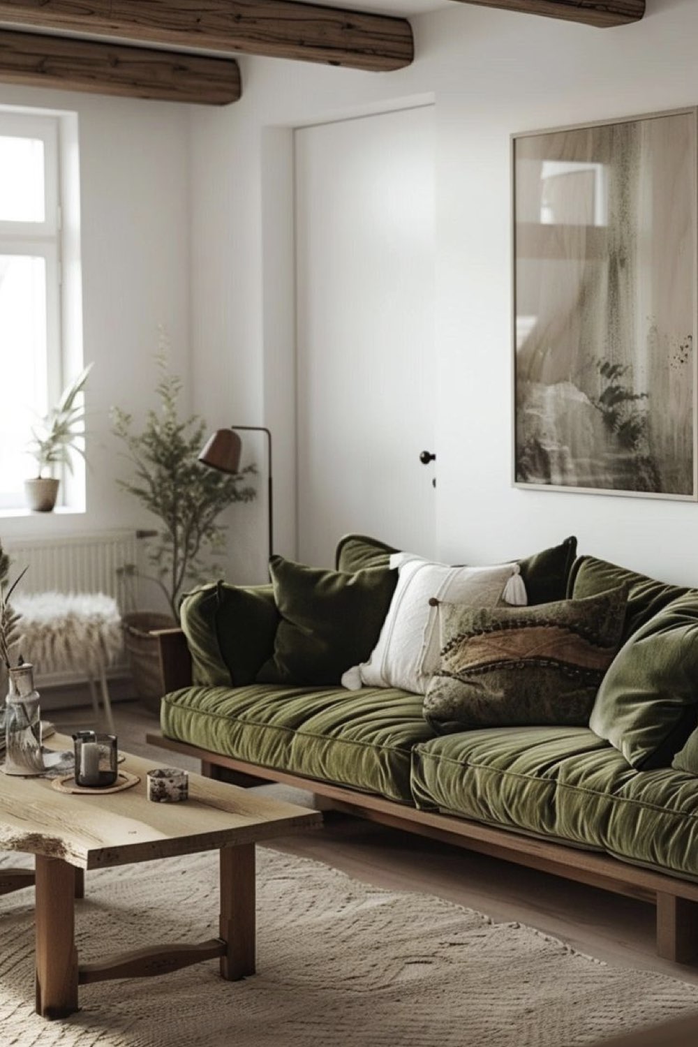 Dans un salon, un canapé aux pieds en bois clair ou une table basse en bois brut peut devenir un point focal, tout en renforçant la sensation de confort. Les textures naturelles du bois, qu’il soit clair, foncé ou vieilli, s’accordent avec des éléments végétaux, comme des plantes en pot ou des bouquets de fleurs séchées, pour renforcer l’aspect organique de l’espace.