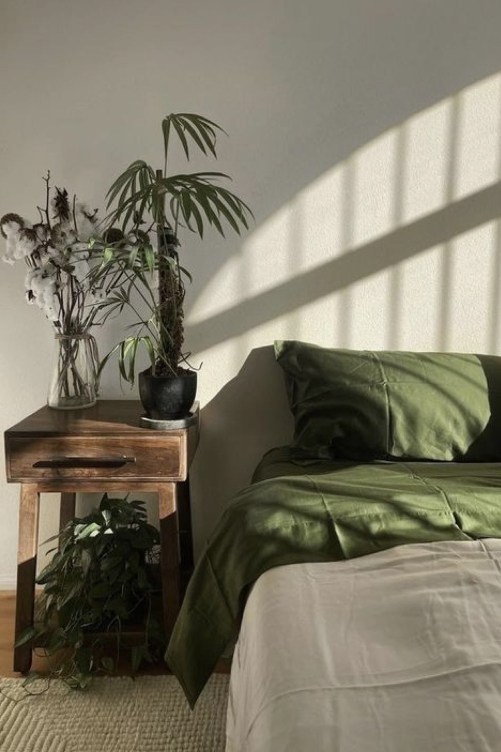 J'ai évoqué les couleurs plus haut, elles ont tout à fait leur place dans la chambre, même si ce n'est que sous la forme d'un mur accent. Les verts sauges et kaki par exemple vont offrir à votre espace une douceur toute singulière. Le terracotta qui fait parti des couleurs terreuses sera plus chaleureux. Ces couleurs naturelles en uni sur les murs créeront rapidement un côté nature. Ajoutez à cela une jolie tête de lit en matériau naturel (bois, palette recyclée, rotin), des luminaires tressés et quelques motifs végétaux (affiches, linge de lit...) et vous aurez une chambre moderne et nature en un clin d'oeil.