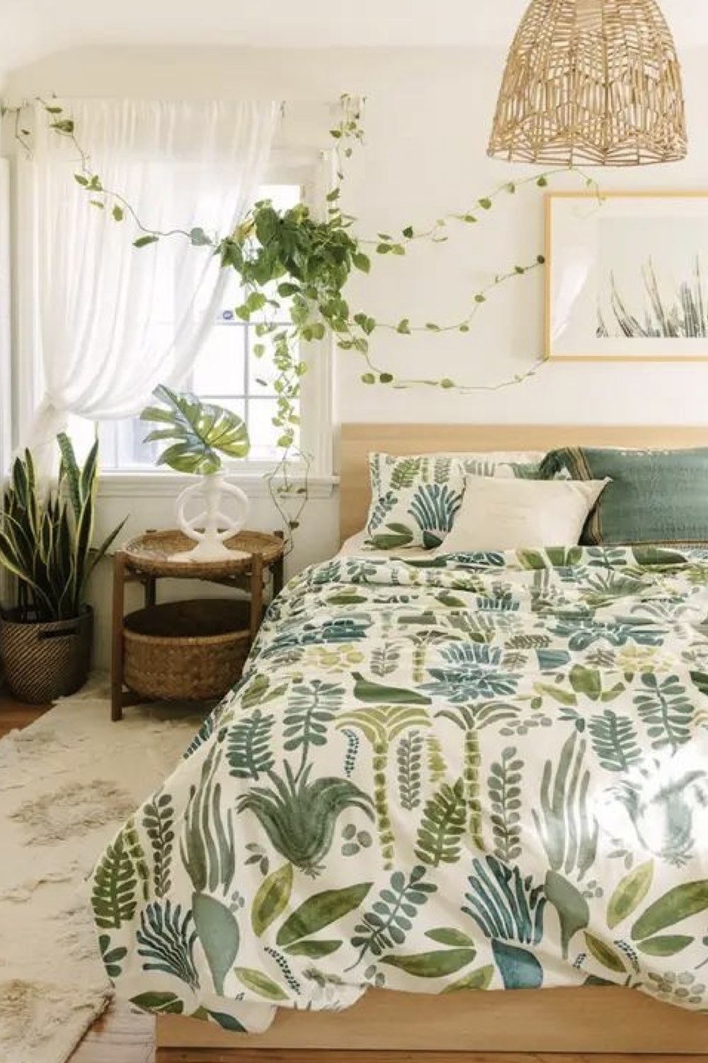 Les textiles sont partout dans la maison et ils sont de très bons alliés pour apporter une touche végétale chez soi sans pour autant avoir des plantes. Pour le linge de lit, vous aurez un choix fou de motifs: feuillage tropical, plantes vertes plus ou moins graphiques, paysages verdoyants... Le choix et les possibilités sont tout aussi vaste quand on parle de housses de coussins. Et si l'art de la table est quelque chose qui vous tient à coeur, ces motifs se retrouvent sur la nappe ou encore les serviettes de table.