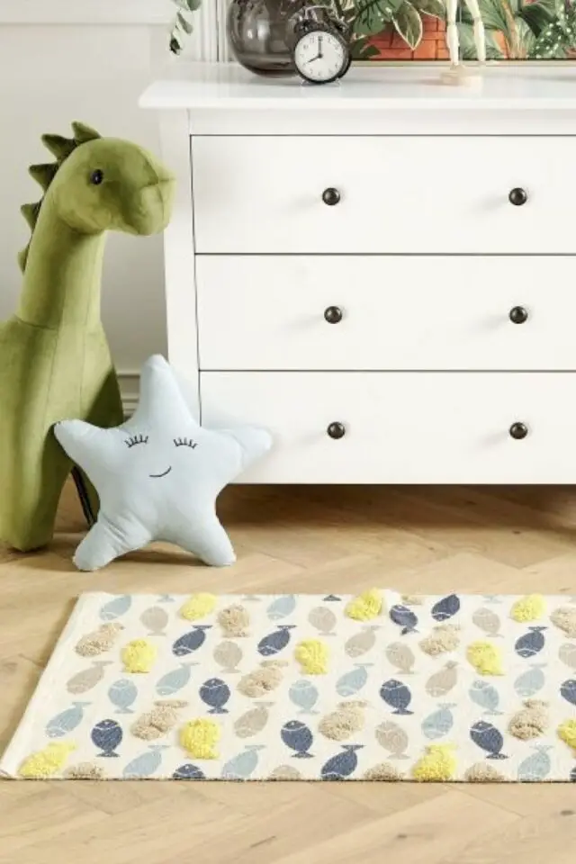 La baleine est un animal marin que l'on retrouve facilement dans les dessins animés. On la retrouve par exemple dans l'histoire de Pinocchio - même si elle a une allure assez dangereuse. Heureusement en motif sur le tapis, la baleine est plus douce. Ses arrondis sont rassurants et simples. C'est un animal marin qui fait rêver à des contrées inaccessibles. On trouve dans le même registre des tapis enfant imprimés "poisson". Niveau couleur (ça vaut pour les tapis et le reste de la chambre), on a généralement une base neutre chaleureuse, notamment du beige associé à du bleu, plusieurs nuances parfois. Une grande douceur découle de ce thème.