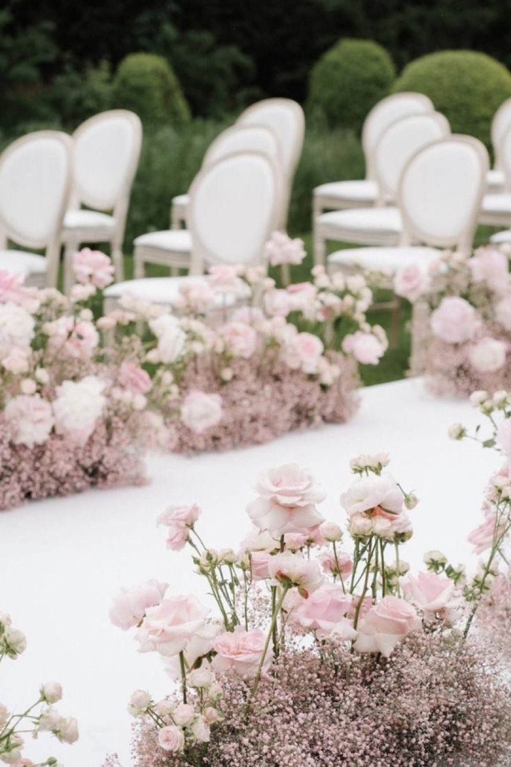 11 • Marquer l'allée avec des fleurs roses et blanches pour une union en extérieur