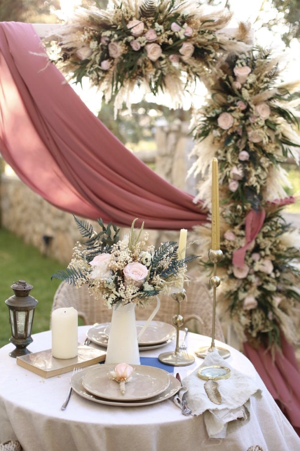 01 • Drapés blancs et roses pour cacher la tonnelle d'un mariage en extérieur
