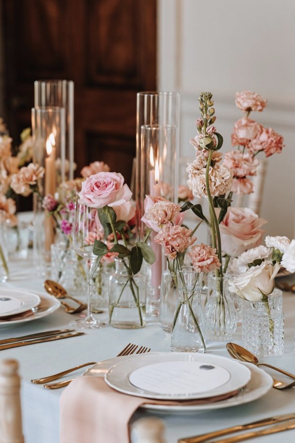 15 • Apporter du volume au chemin de table avec des roses en soliflore et des chandelles colorées
