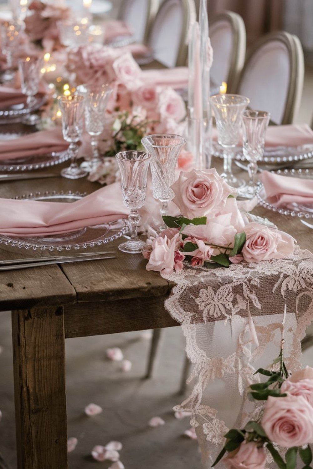 20 • Chemin e de table fleuri associé à des chandelle torsadées de différentes nuances de rose