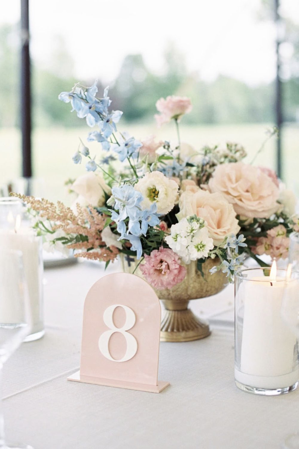 05 • Numéro de table coloré et centre de table fleuri en rose, beige et bleu