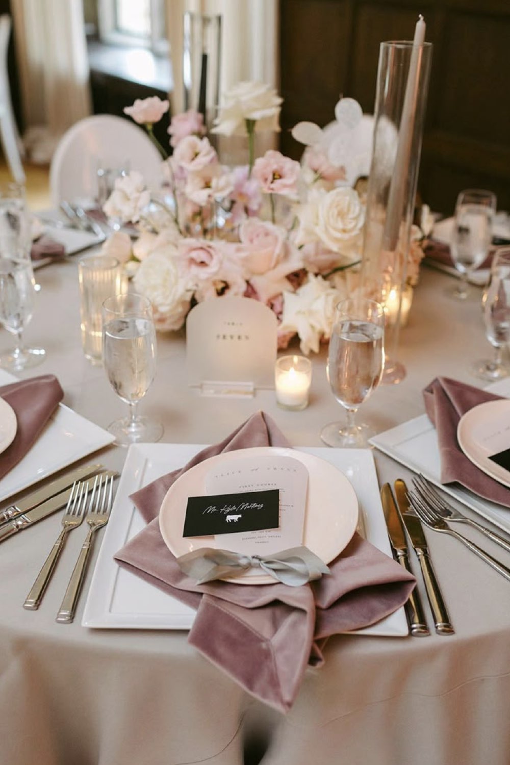 07 • Une déco de table rose et blanche avec une touche de poudré au coeur des assiettes