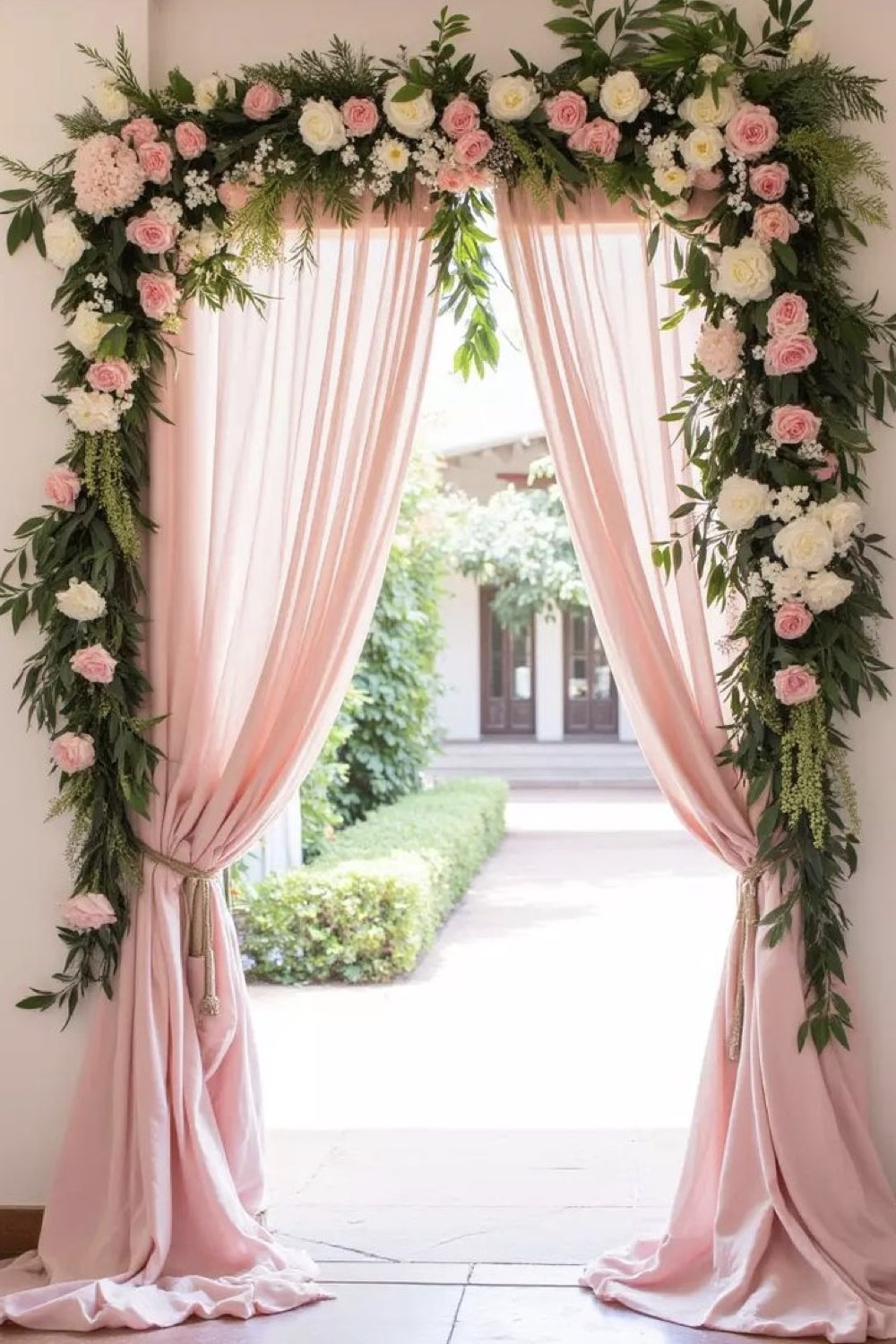 09 • Habiller l'entrée de la salle de réception avec un voilage rose et des fleurs