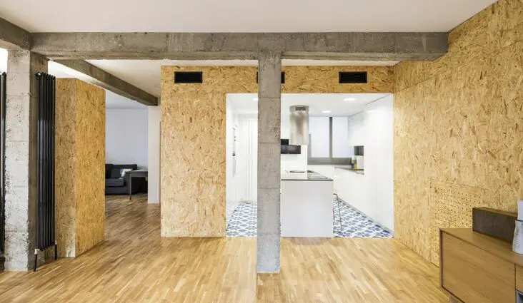 Enfin dans les solutions de matériaux pleins pour l'intérieur, il y a le bois et particulièrement l'OSB. C'est un panneau de bois reconstitué collé avec des résines synthétiques. C'est un matériau léger et robuste. Il est facile à poser (pas besoin de joints). En revanche, son look ne plait pas à tout le monde. L'OSB peut sembler trop fonctionnel, trop brut. Il est souvent recommandé de monter une cloison en OSB dans les pièces fonctionnelles (grenier, garage...)