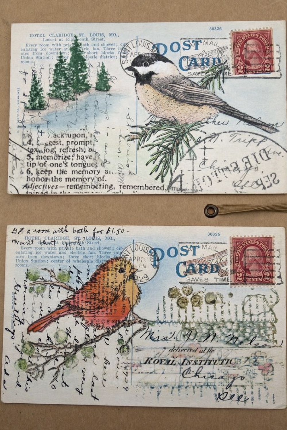 En brocante, il est assez facile de trouver d'anciennes cartes postales. Pour effacer ou du moins atténuer le message déjà écrit, passez un peu d'acétone sur un coton tige et laissez sécher. Ensuite, vous êtes libre de dessiner, coller, créer une nouvelle carte au dos de l'ancienne.