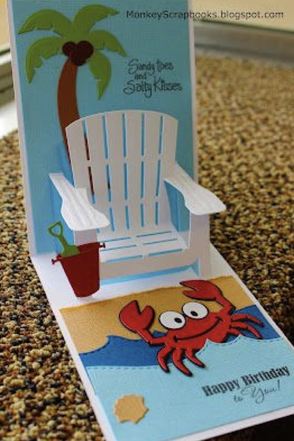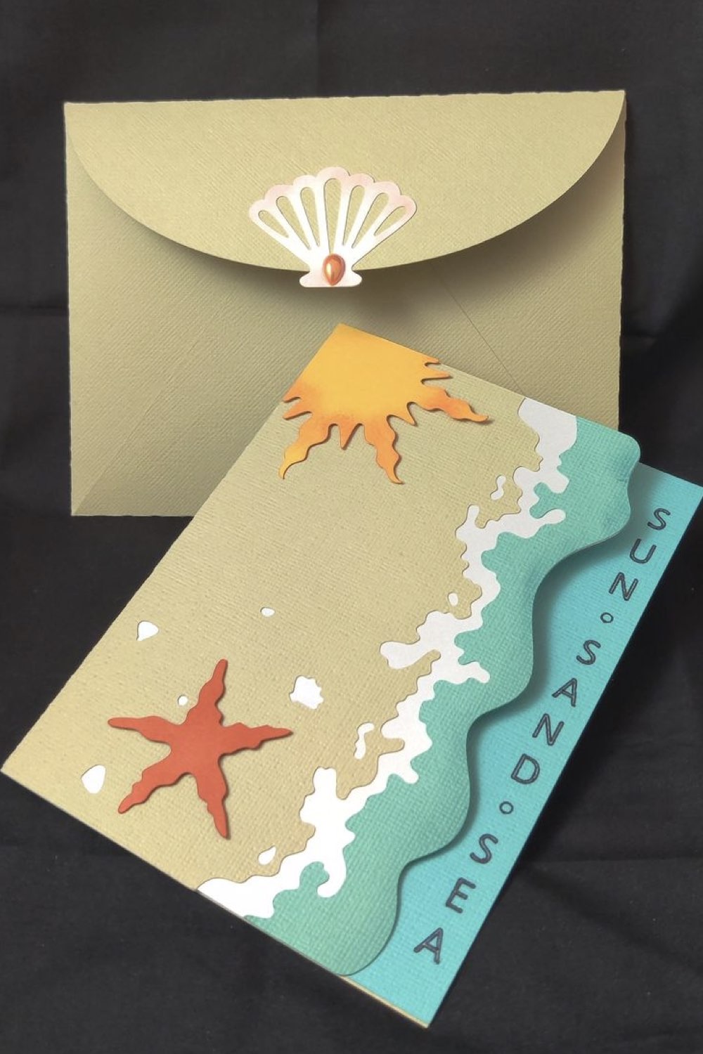 Un bon scalpel, plusieurs feuilles de papiers cartonnés et de la patience, c'est essentiellement le matériel nécessaire pour reproduire cette carte qui reprend l'idée de la plage de vos vacances. La superposition de feuilles cartonnées donnera un petit relief à la carte qui est sympa.