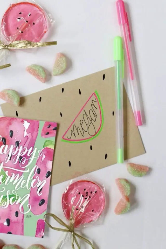 Si vous ne me connaissez pas et que vous arrivez sur le blog pour la première fois, il faut savoir que j'aime le simple, le minimalisme et quand il est question de papèterie, j'aime énormément le papier kraft. Donc quand j'ai vu ce septième exemple, je l'ai beaucoup aimé. La pastèque est un fruit qui passe toujours bien en été et qui peut être simple à reproduire avec un feutre rose, un feutre vert et un noir pour les pépins.