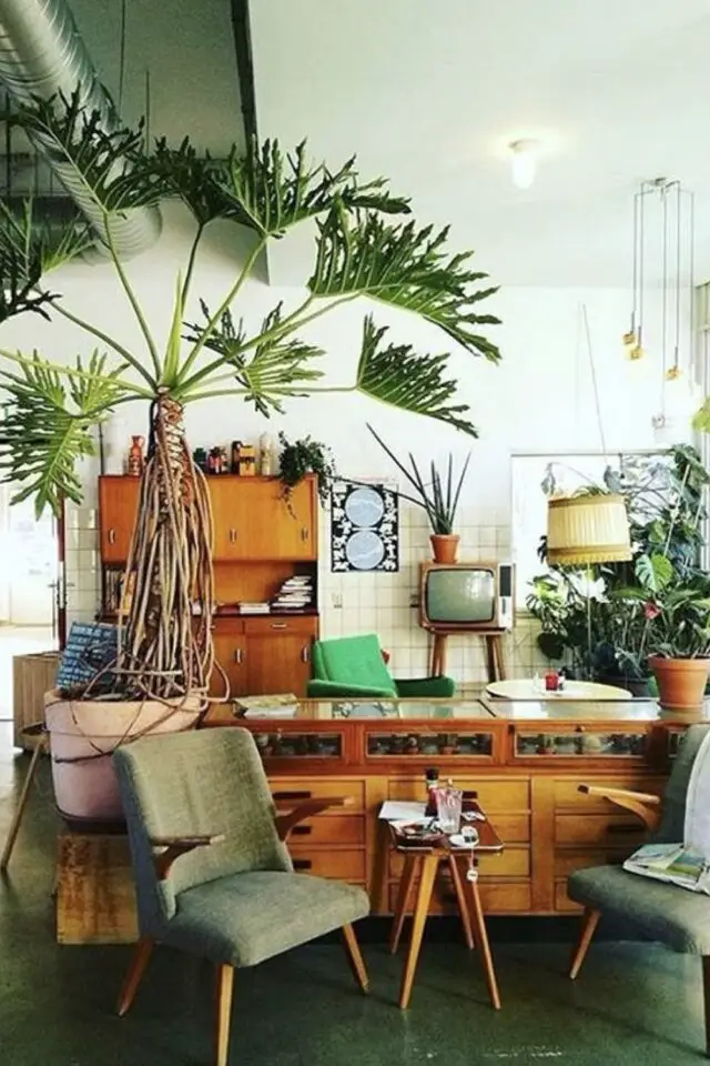 Avec un peu de chance, il est possible de trouver des meubles de cette époque en brocante pour pas trop cher. Les plantes tropicales apportent quant à elles une touche plus verte mais aussi une géométrie singulière. Le découpage des feuilles casse le rythme fonctionnel du mobilier.
