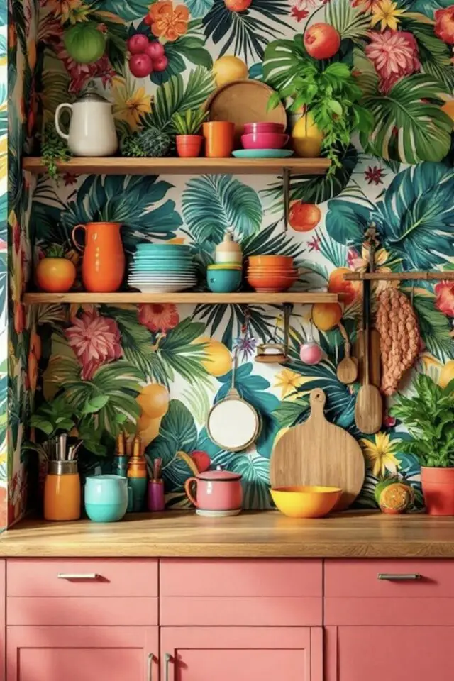 Je trouve cet exemple de cuisine très joyeux, pas vous? J'aime les façades roses pour les meubles bas, le papier peint tropical qui fait voyager, la vaisselle colorée posée sur les étagères. Le papier peint ici contribue grandement à l'effet maximaliste / éclectique. Une toile de fond qui habille le mur de la cuisine et lui donne beaucoup de personnalité. Pour moi, c'est un peu trop chargé mais peut-être que cet exemple vous parlera et vous inspirera.