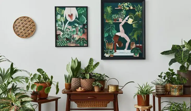 Style éclectique et maximalisme sont souvent associés ensemble. L'éclectisme peut passer (mais ce n'est pas une obligation) par une quantité de déco importante. Et comme ici on cherche à voir comment l'esprit nature et le style éclectique peuvent être mariés, quoi de mieux que d'opter pour de très nombreuses plantes. Tailles, variétés, places qu'elles occupent dans la pièce... Un mélange urban jungle qui personnalise une pièce de vie au départ blanche. L'idée de nature est renforcée aussi grâce au mobilier: canapé vert, table basse en bois.