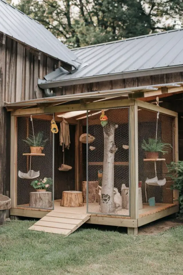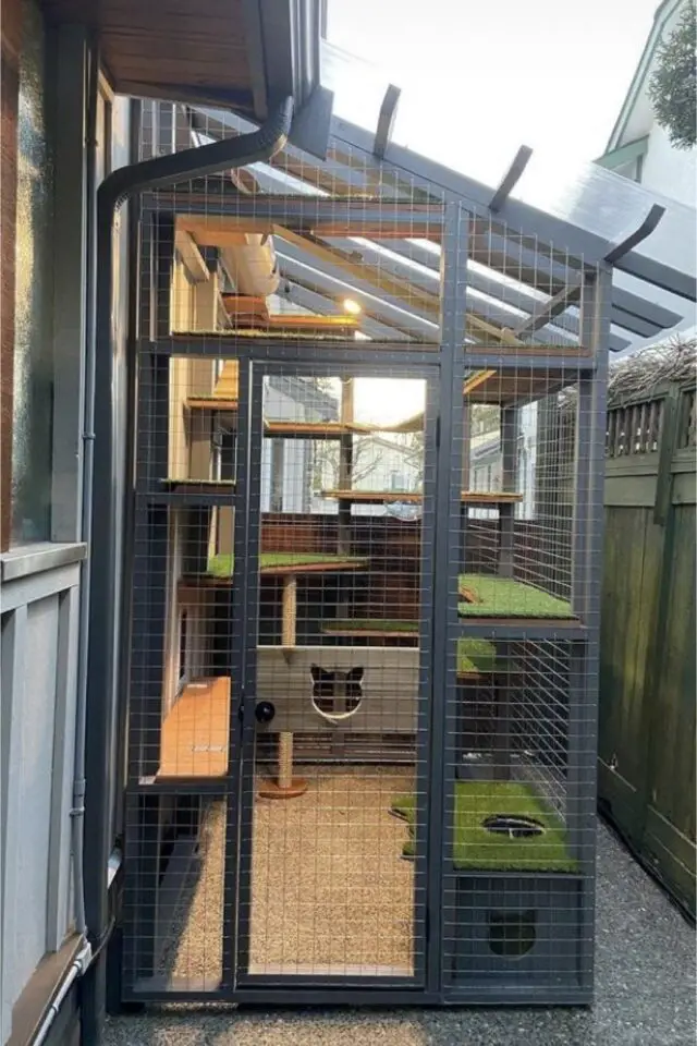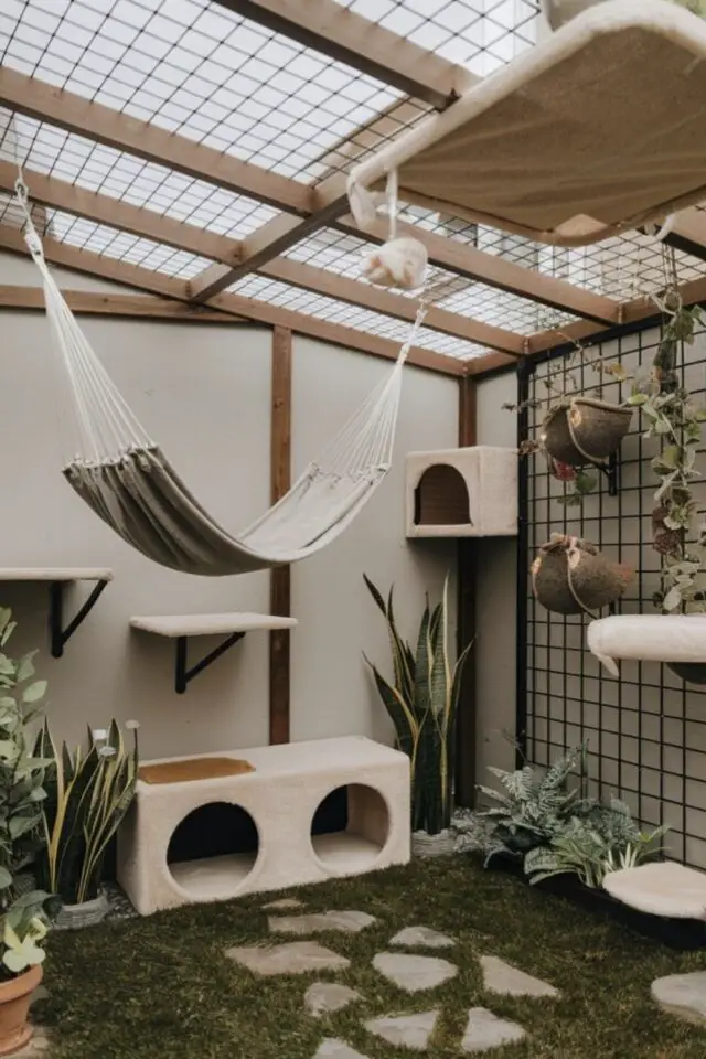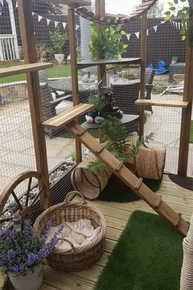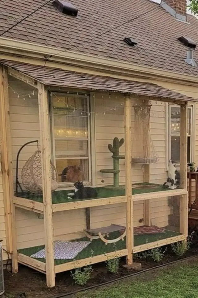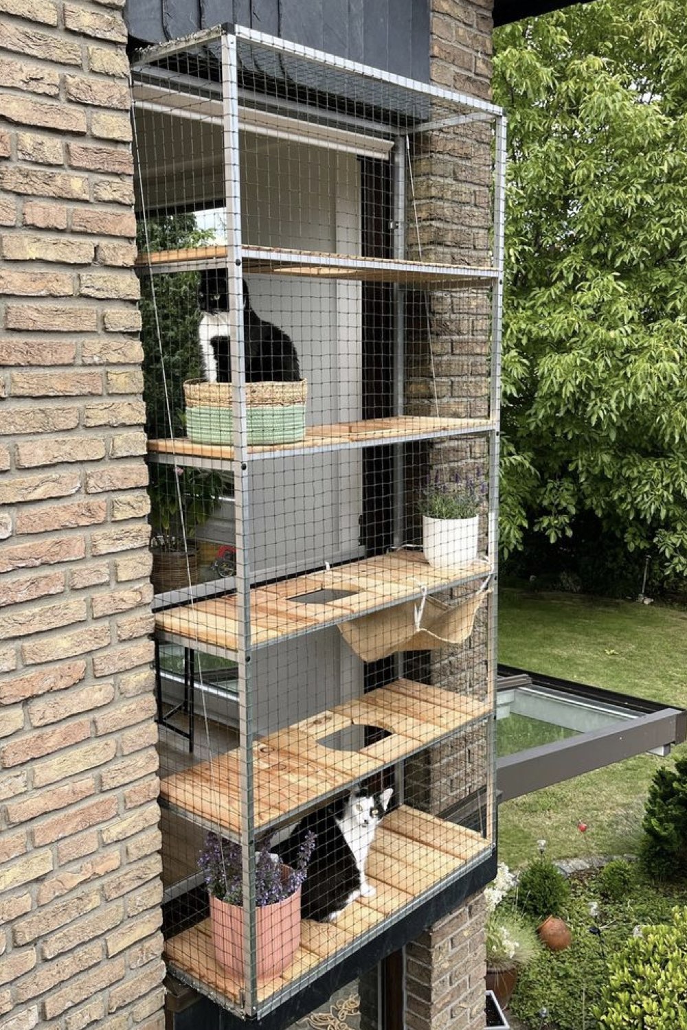 Ce qui est intéressant avec l'idée du catio, c'est qu'en plus d'offrir un accès sécurisé à votre chat pour profiter de l'extérieur, il est possible de créer un espace ludique. Ajoutez des plateformes à différentes hauteurs, des échelles, des endroits où se cacher... pour que votre chat ne tourne pas en rond comme un lion en cage. Il est aussi possible d'ajouter un griffoire, un arbre à chat au milieu, une caisse avec un plaid ou un coussin.