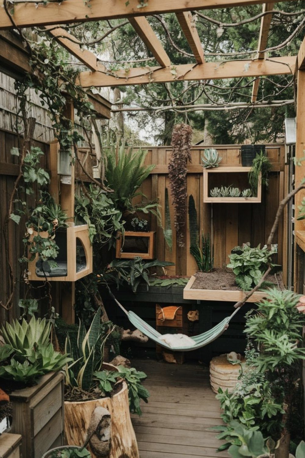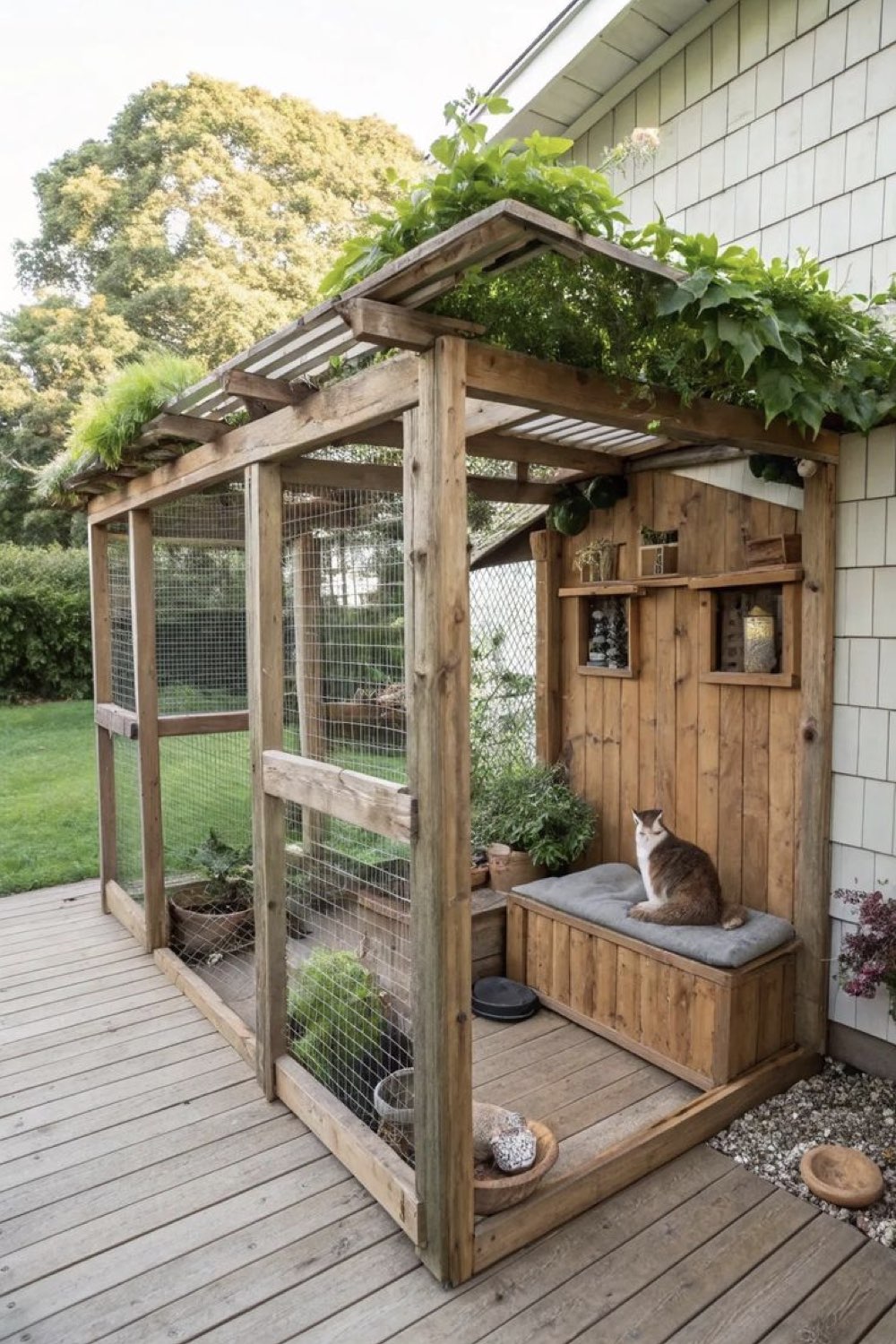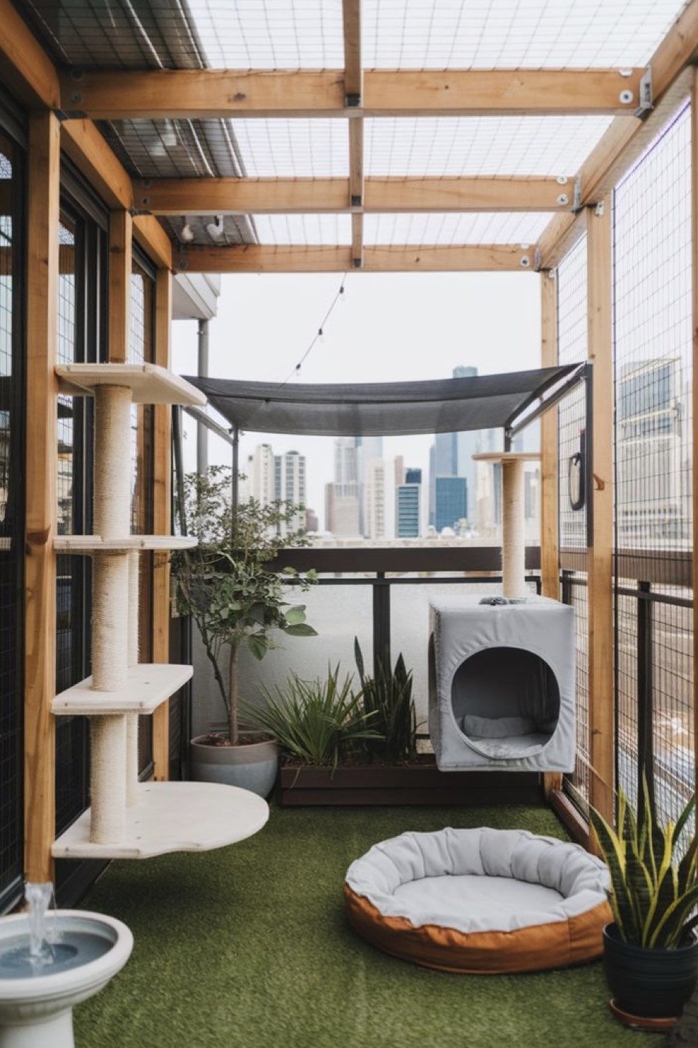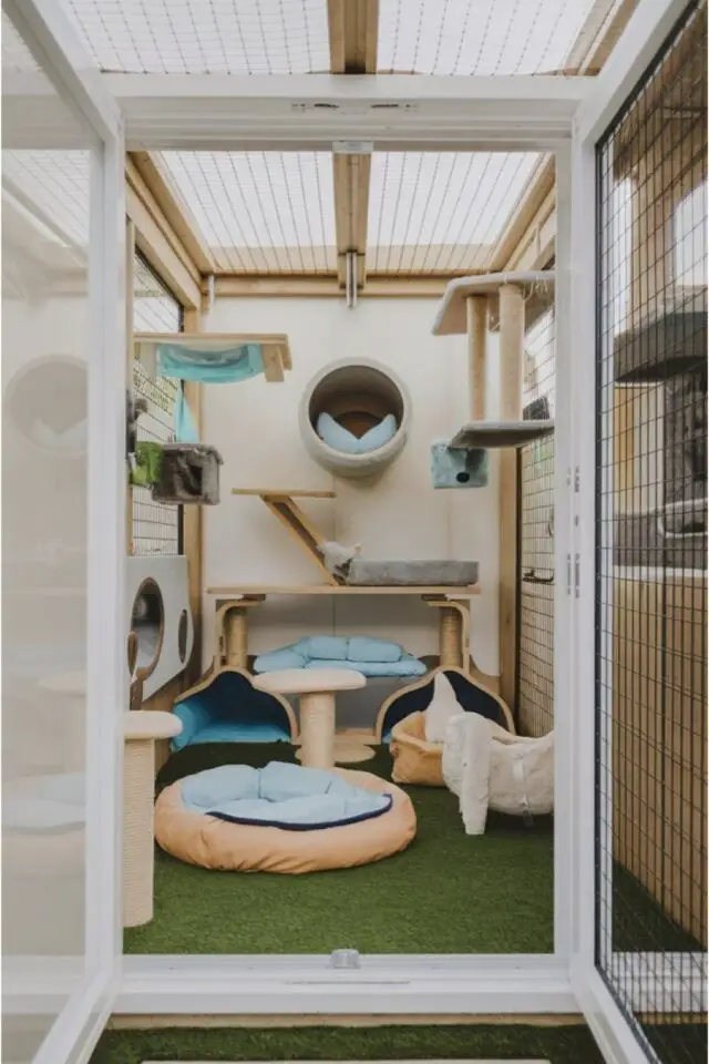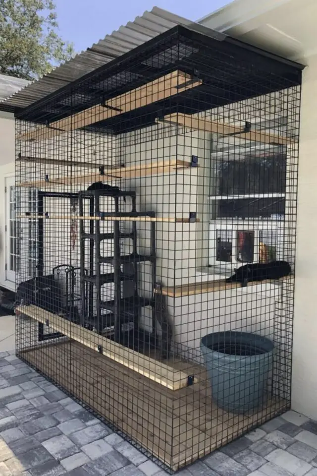 Ce qui est intéressant avec l'idée du catio, c'est qu'en plus d'offrir un accès sécurisé à votre chat pour profiter de l'extérieur, il est possible de créer un espace ludique. Ajoutez des plateformes à différentes hauteurs, des échelles, des endroits où se cacher... pour que votre chat ne tourne pas en rond comme un lion en cage. Il est aussi possible d'ajouter un griffoire, un arbre à chat au milieu, une caisse avec un plaid ou un coussin.
