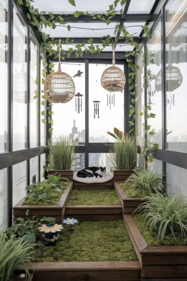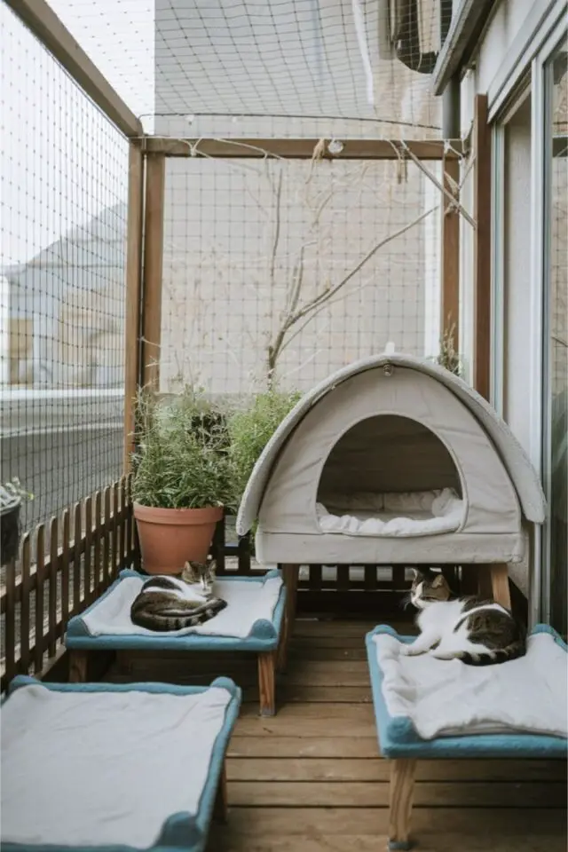 Comment installer un catio sur le balcon? Il n'est pas nécessaire de transformer l'ensemble de votre balcon en catio. Vous pouvez très bien baliser une petite partie de votre espace extérieur pour que votre chat puisse en profiter. Plutôt que d'offrir l'ensemble de votre balcon à votre chat, vous pouvez plutôt choisir un aménagement en hauteur avec des "étages" ce qui est plus ludique et moins encombrant.