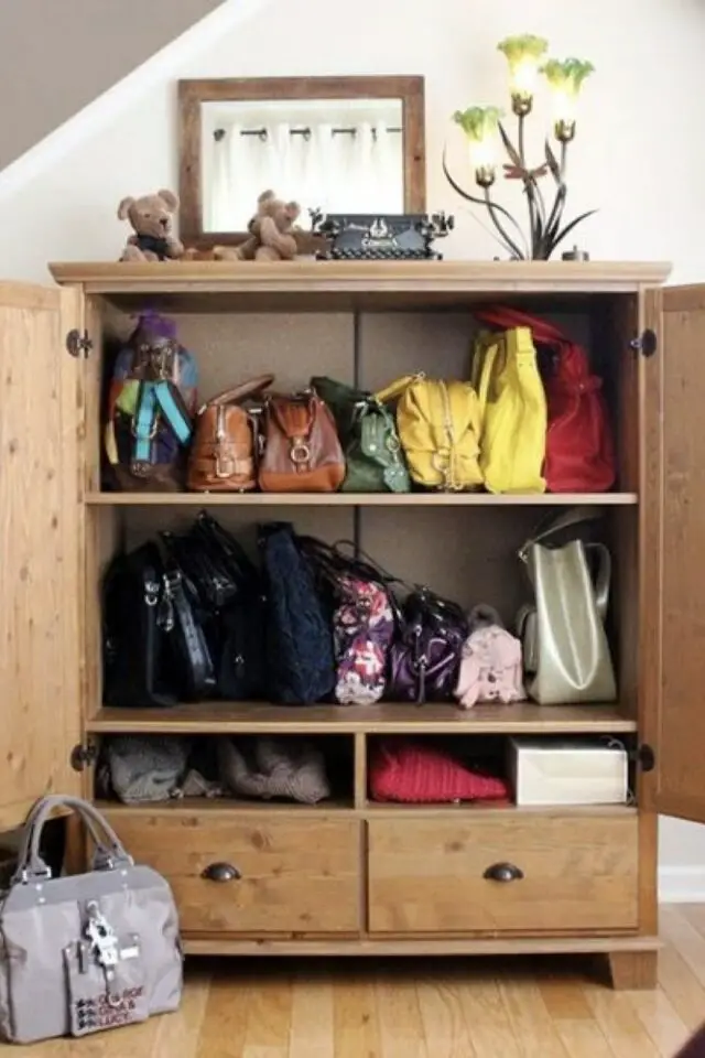 Si vous avez de la place, rien ne vous empêche de dédier un meuble au rangement de vos précieux sacs à main. Une jolie armoire parisienne par exemple dans l'entrée, dans le couloir menant aux chambres ou encore dans la chambre. Cela peut sembler une solution facile mais il n'y a rien de mal à choisir la facilité. C'est souvent les meilleures solutions!