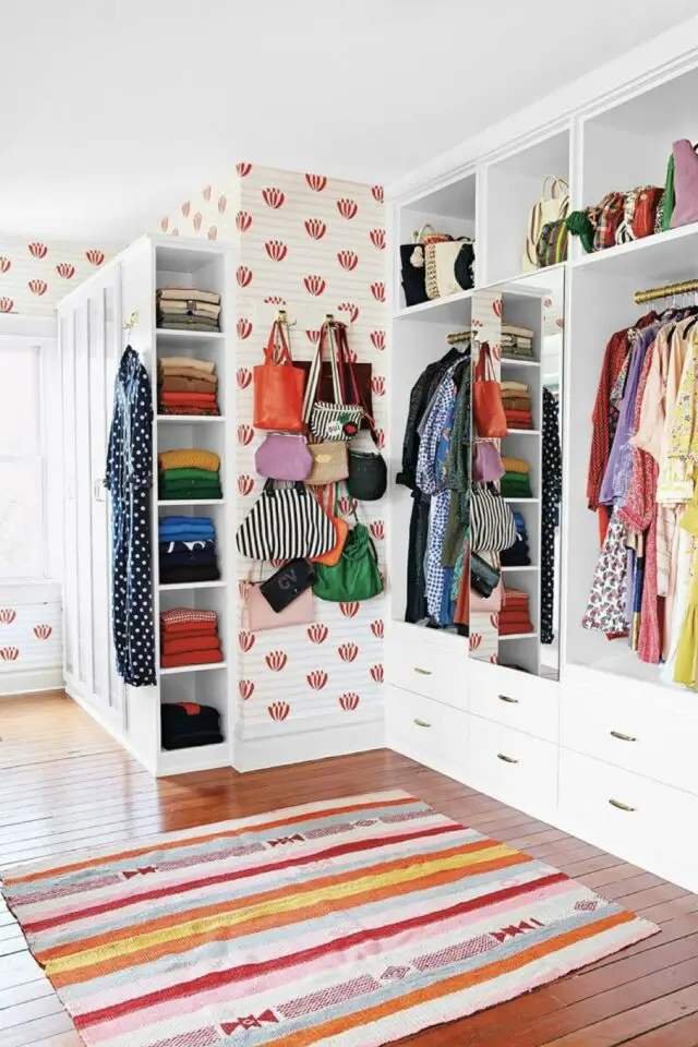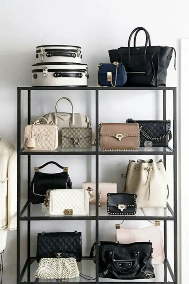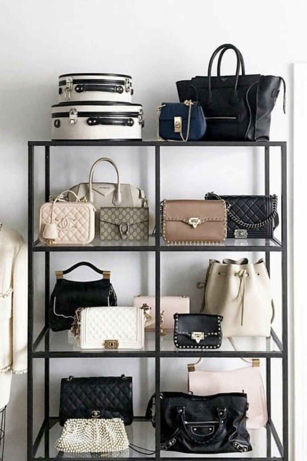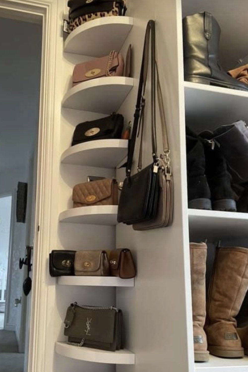 Je parlais de dressing un peu plus haut. Il est possible de maximiser le rangement de l'espace pour ranger les sacs à mains. Si vous avez un coin vide, des étagères d'angles peuvent être de précieux alliés pour les petits sacs. Cette solution est extra quand on cherche à optimiser le moindre centimètre carré du dressing!