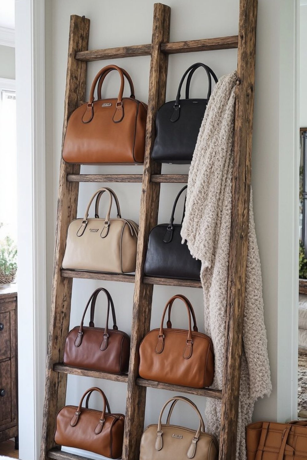 Un bon système de rangement, ce n'est pas juste une manière de ranger / dissimuler ce qui ne sert pas. C'est aussi un système qui prend en compte vos habitudes quotidiennes. Dans une collection de sacs à main, je fais la différence entre le ou les sacs qui servent tous les jours et ceux que l'on sort occasionnellement (pour une tenue spécifique ou une grande occasion par exemple). Les sacs du quotidien ne doivent pas être perdus dans le fond d'un placard. Vous n'allez pas aller les chercher chaque matin dans la chambre. Donc, l'idéal est de trouver une solution pratique et esthétique pour l'entrée. Une échelle récup' peut être une solution!