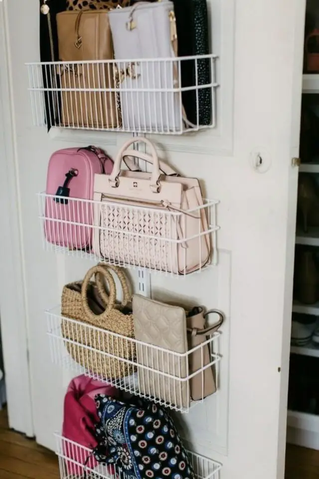 Autre solution pratique pour les petits et moyens sacs à main: les paniers métalliques. Ils se fixent sur une crémaillère qui elle-même est fixée sur la porte. Une solution en partie modulable puisque vous choisissez le nombre de paniers et la hauteur à laquelle vous les accrochez.