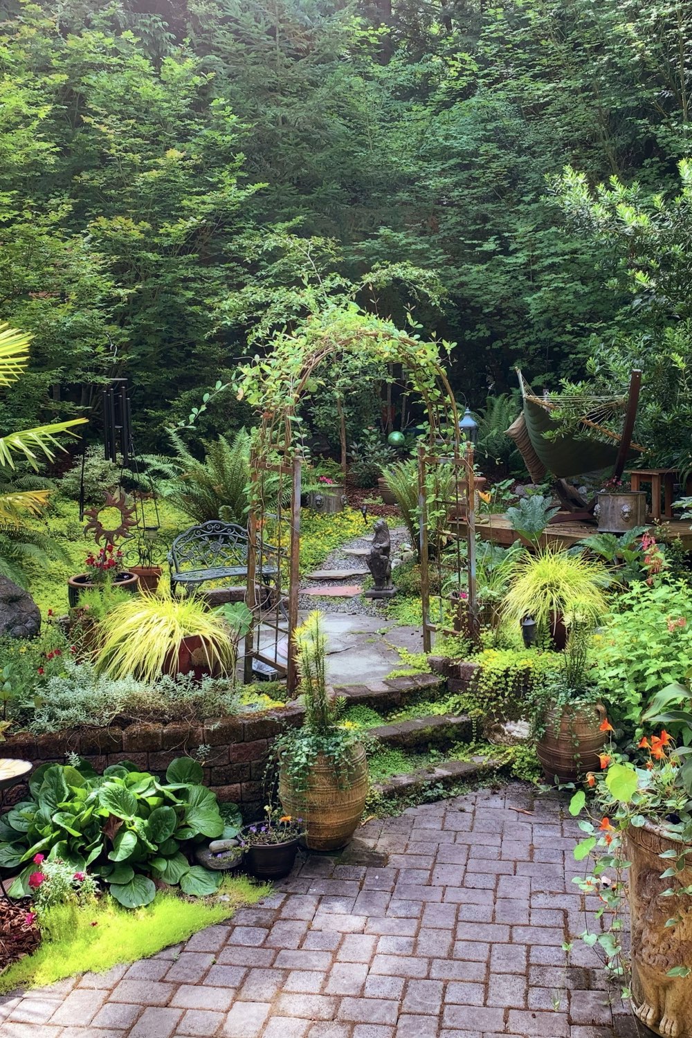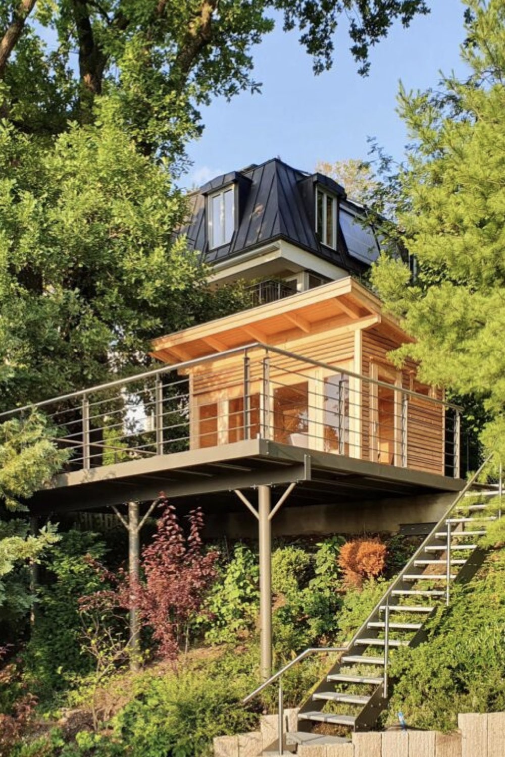 Si j'avais un grand jardin en pente, il y aurait plusieurs terrasses sur pilotis, des terrasses asymétriques un peu comme plusieurs niveaux d'une cabane dans les arbres. Il y aurait plusieurs espaces distincts avec la table extérieur au plus près de la maison (par soucis pratique). Au calme, un salon de jardin cosy en bois avec une pergola verdoyante dessus pour protéger des rayons du soleil. Il y aurait aussi tout un système électrique pour pouvoir éclairer chaque espace indépendamment (et brancher un ventilateur à certains endroits).