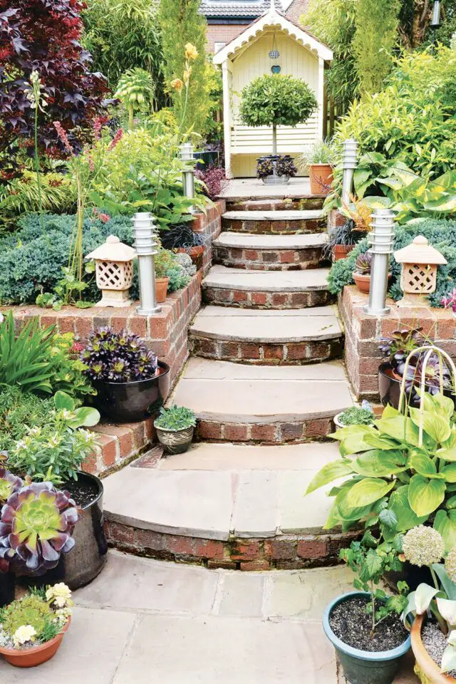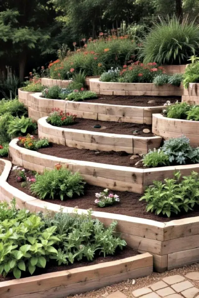 | Terrasse en gradins | Forte pente | - pierre - brique - bois traité | plusieurs niveaux avec des murets de soutènement ou des palissades en bois |