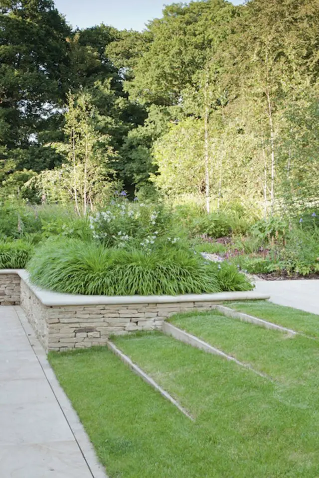 Pour revenir à votre jardin, on peut imaginer un aménagement avec ces mêmes caractéristiques. Cela demande un gros travail de terrassement mais le jeu en vaut la chandelle puisque vous pourrez profiter pleinement de votre jardin malgré son dénivelé. On peut aussi garder l'idée de créer des terrasses qui épousent la forme de la pente pour conserver une esthétique naturelle.