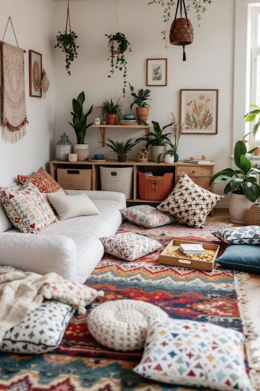 Les textiles décoratifs comme les rideaux, les tapis, les housses de coussin / canapé… sont des accessoires intéressants parce qu’ils peuvent être source de motifs et de couleurs. Dans la déco bohème, mes motifs venus d’ailleurs ont une place toute particulière. Les inspirations viennent de plusieurs régions du monde. Et pour le côté maximaliste, on peut facilement associer plusieurs motifs entre eux.