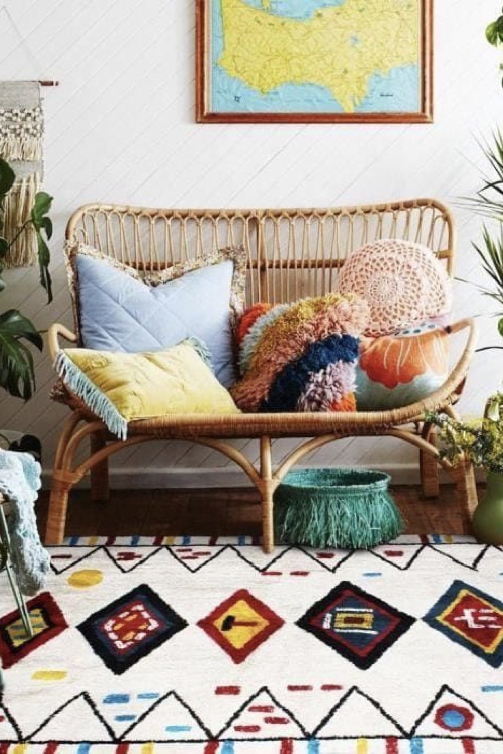Le tapis berbère a été un élément phare du style bohème et il l’est toujours. Il n’existe pas uniquement sous une forme neutre noire et blanche. Il est aussi possible d’en trouver dans des versions plus colorées. Au coeur du salon ou en guise de descente de lit, ce tapis peut être une des composantes de votre déco maximaliste et bohème. Dans la chambre, les rideaux comme le linge de lit va vous permettre d’accentuer l’effet de mélange. Dans le salon, les housses de coussins sont définitivement une touche déco facile à mettre en oeuvre.