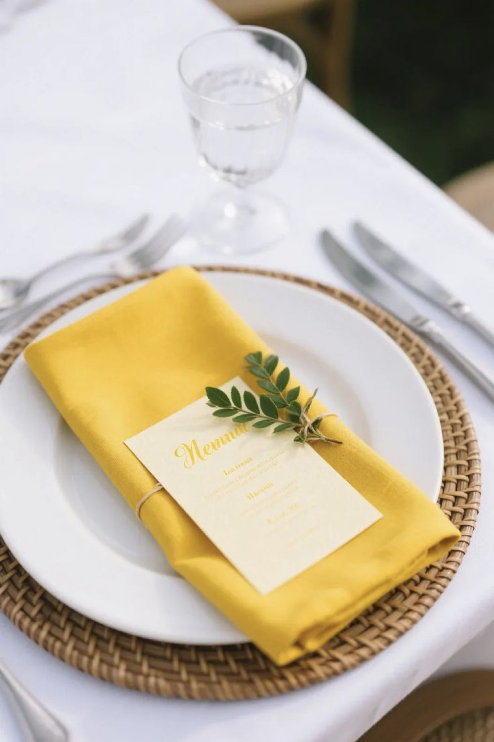 06 • Chemin de table jaune, fleurs et assiettes blanches et une touche chic grâce au liseré doré