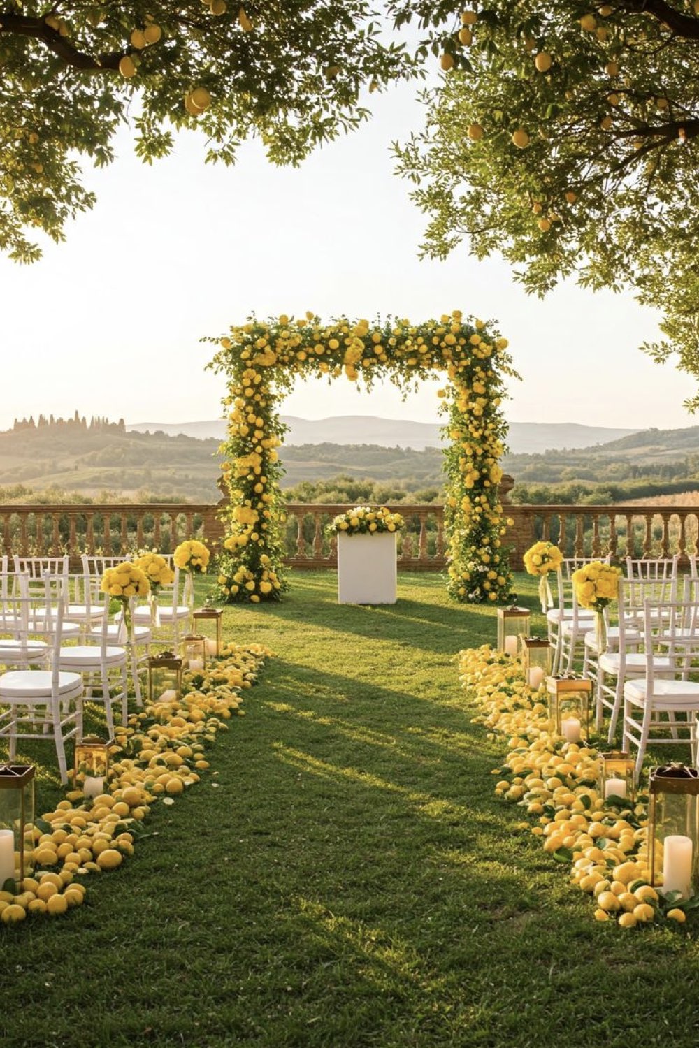 15 • Chaises drapées de jaune et petits bouquets ronds de plusieurs nuances de jaune
