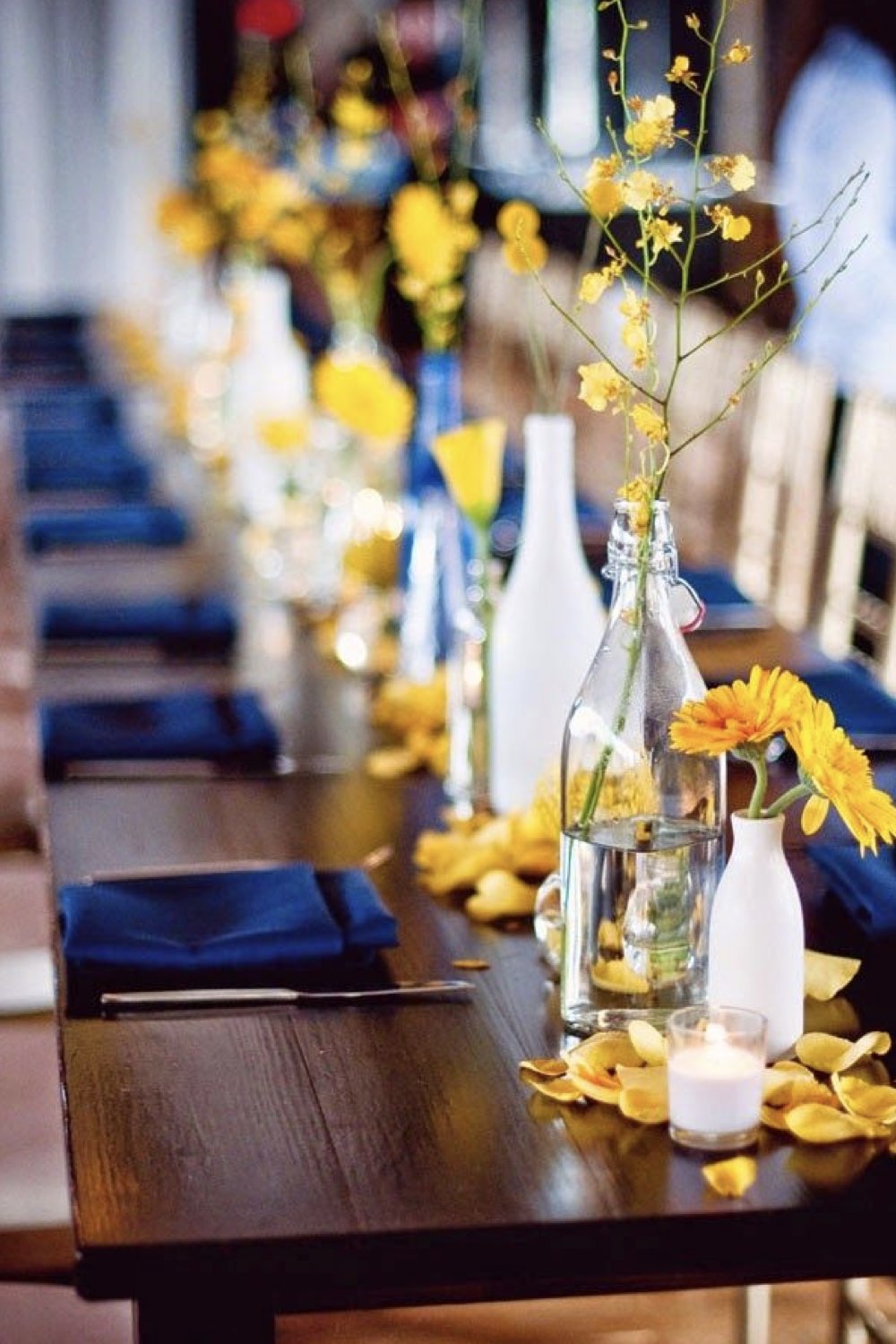 01 • Une table de mariage en jaune et bleu avec des chandelles sourdes et des citrons