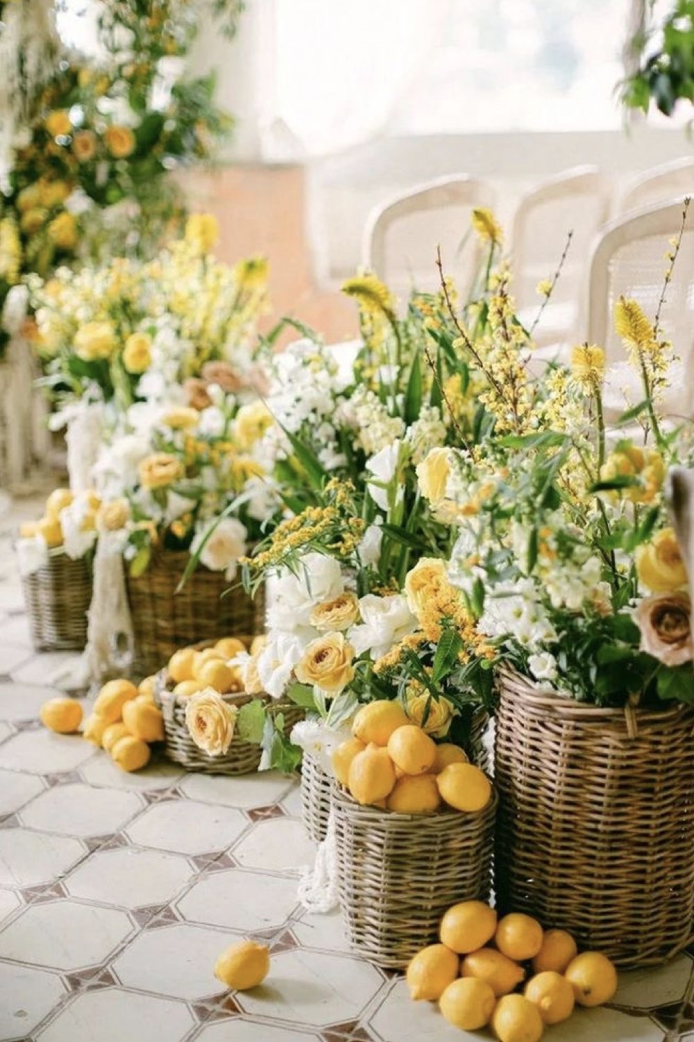 18 • Chaises blanches, compositions florales colorées et citrons