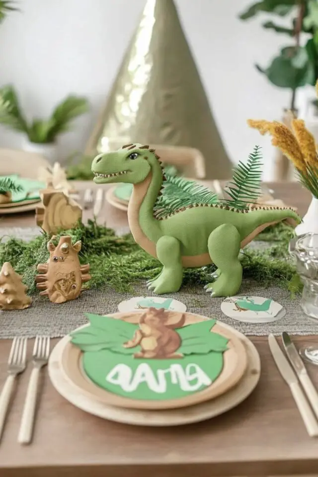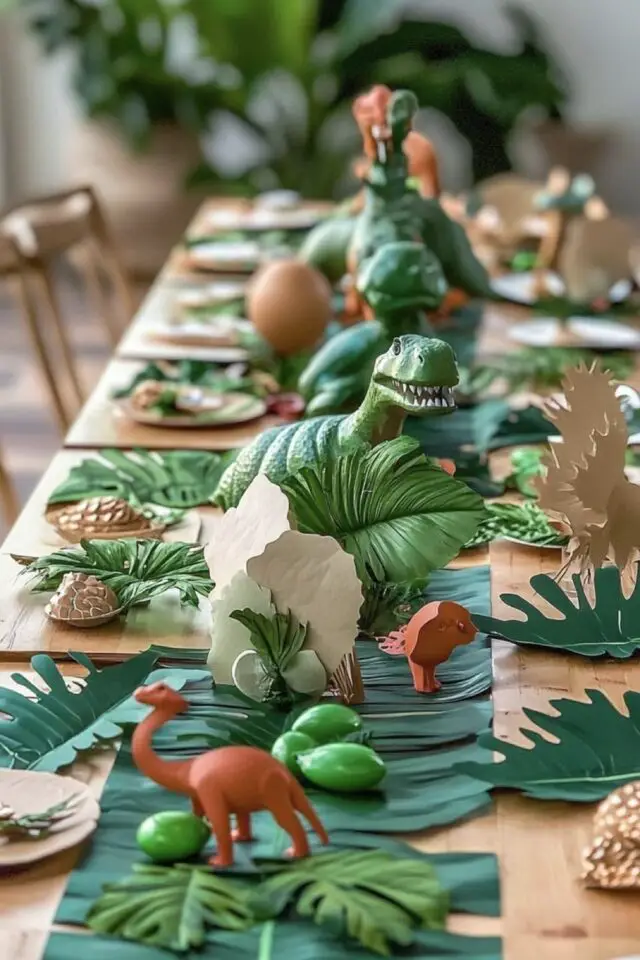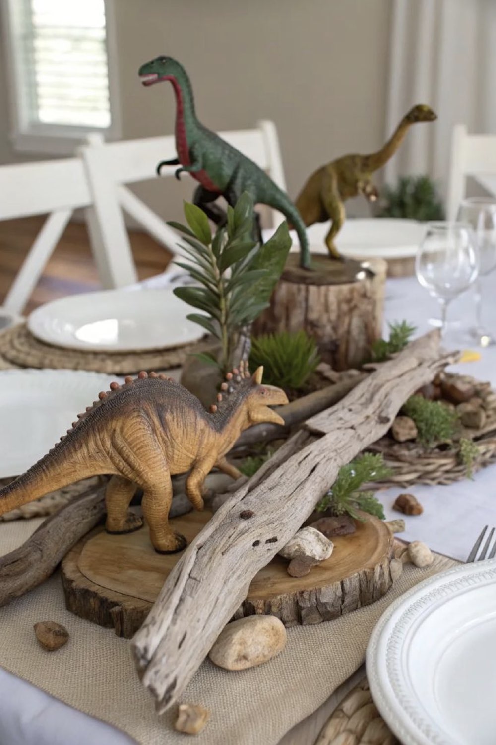 - associer des jouets dino, un peu de mousse naturelle et des rondins de bois pour créer un centre de table