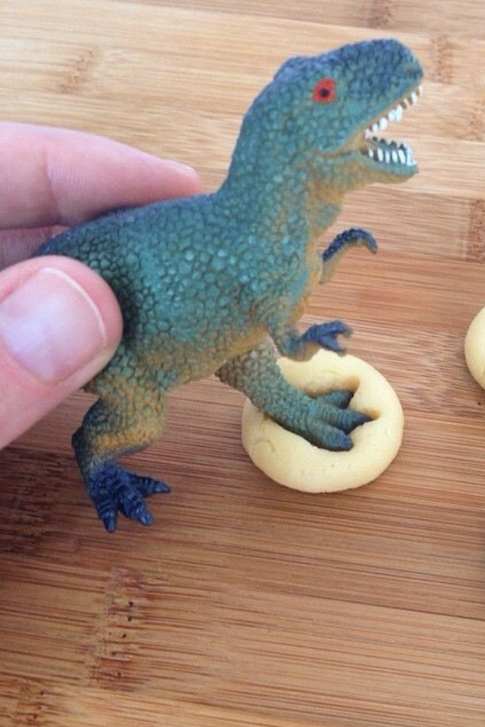 - imprimer des empreintes de dinosaures dans de la pâte à sel (ou des cookies) en utilisant les jouets de votre enfant