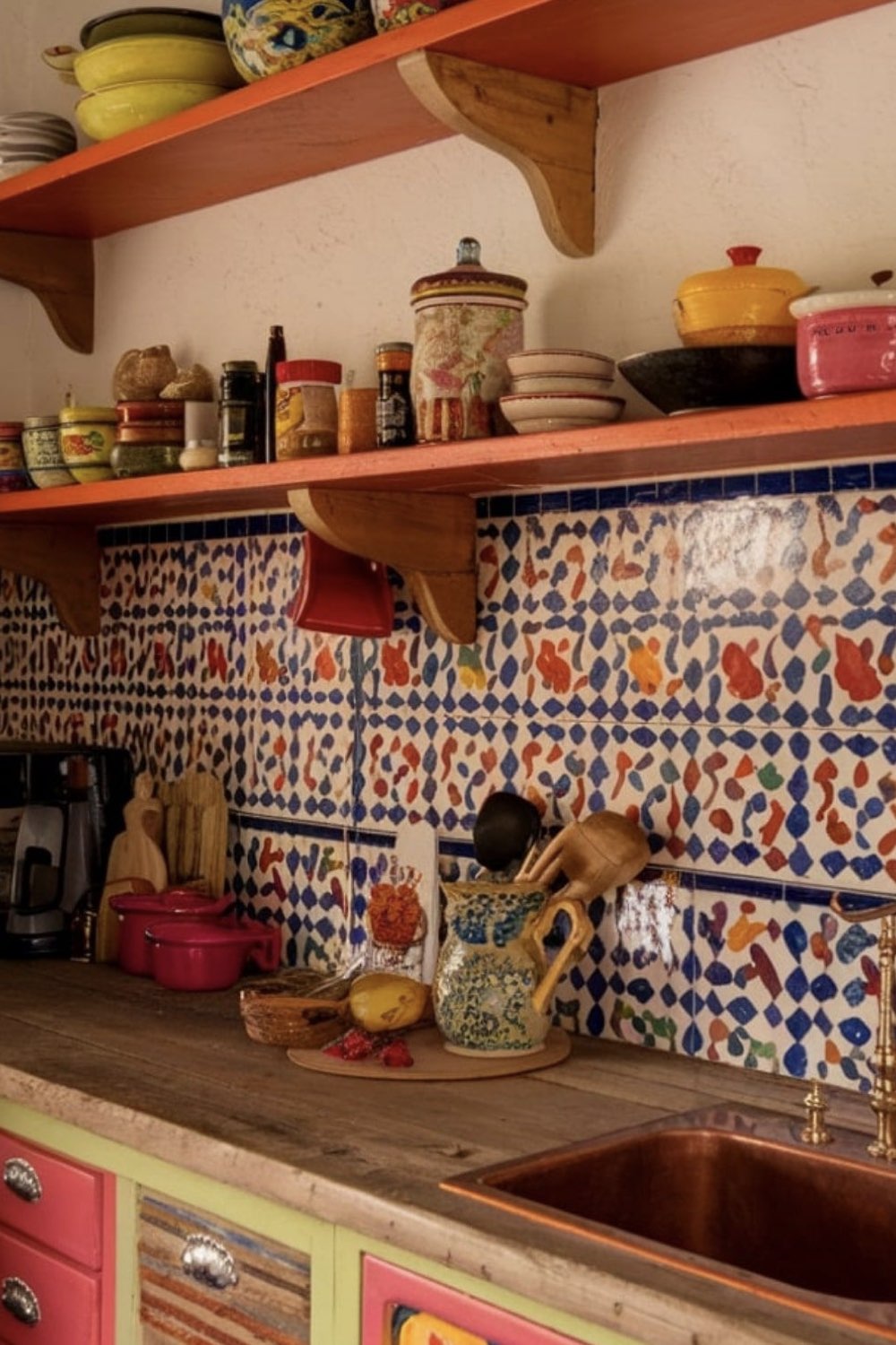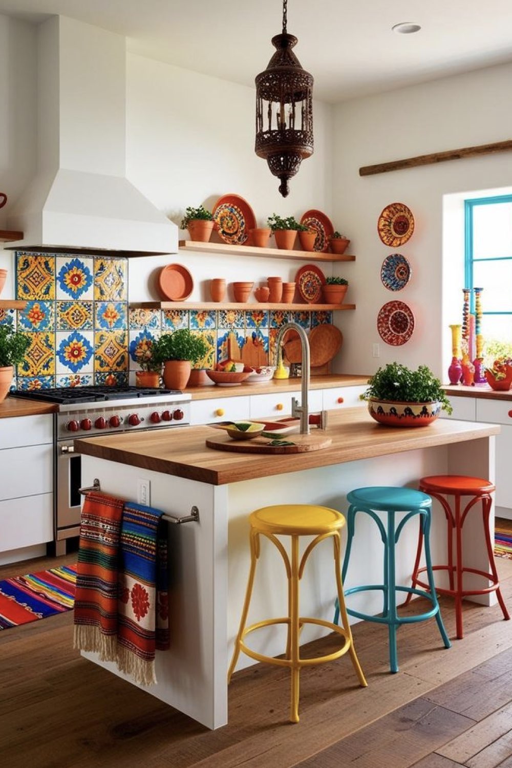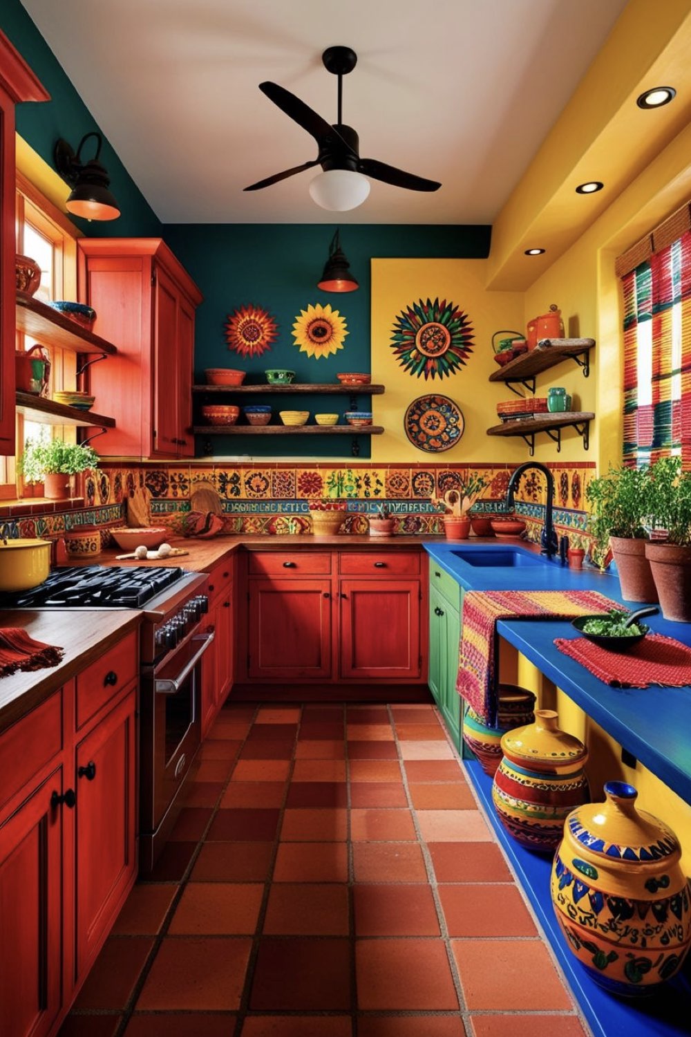 Que ce soit dans une cuisine ou ailleurs dans votre intérieur, les couleurs qui évoquent le Mexique sont souvent utilisées en grande quantité et en grand nombre. On ne va pas nécessairement respecter ici la règle des 60/30/10 généralement utilisées pour équilibrer les couleurs dans un espace. Cette multitude de couleur va créer un contraste fort et joyeux dans votre pièce de vie.