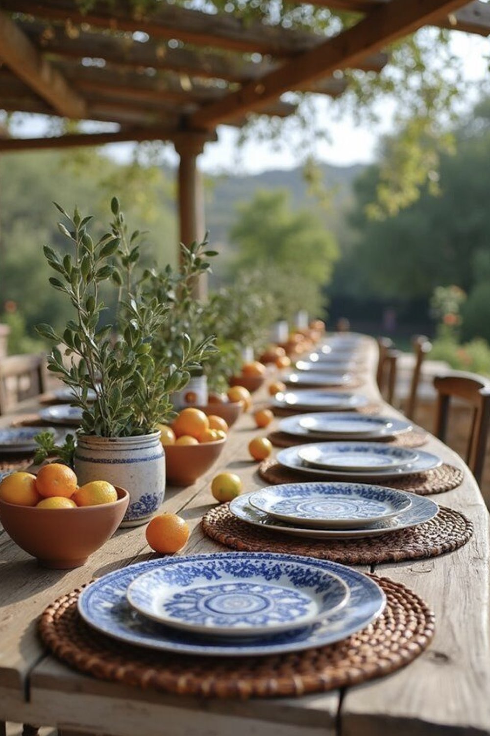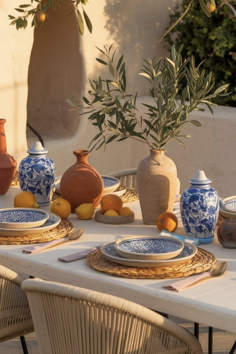 Une table simple avec des détails bleus et blancs et des vases en terre cuite