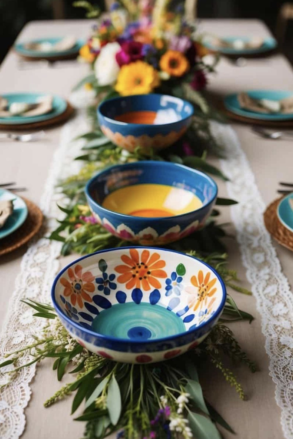 Bols et saladiers colorés aux motifs d'ailleurs en guise de chemin de table