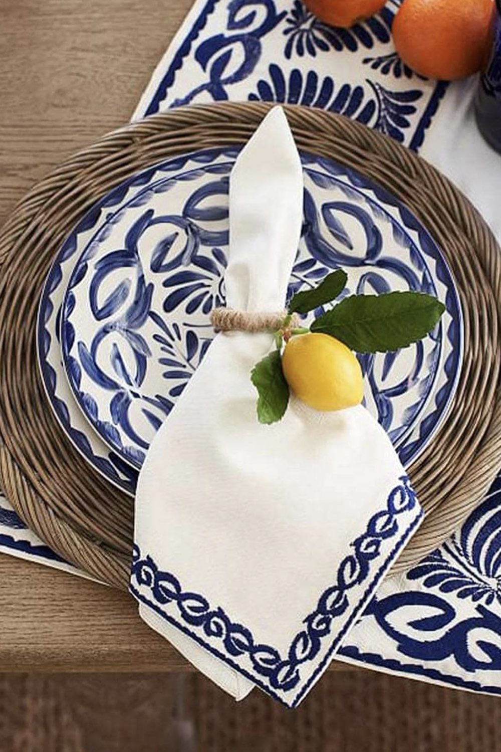 Même si la décoration de table inspirée des pays méditerranéens est assez simple. Il est possible de faire un peu de DIY, notamment avec ce rond de serviette. De la ficelle à rôti que l'on noue comme un macramé, un une branche de citron avec ses feuilles et voilà. Vous avez un rond de serviette unique et fait maison.