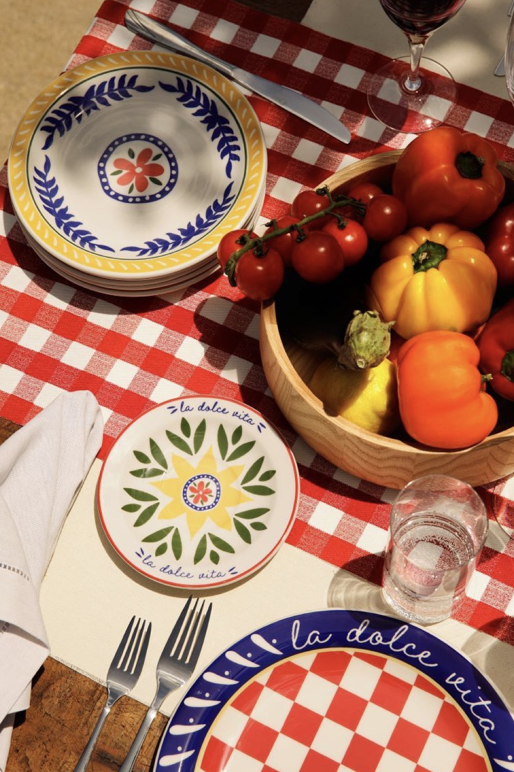 La nourriture ici est vraiment une source d'inspiration. D'ailleurs, je commence à avoir faim. Les légumes méditerranéens sont beaux et gorgés de soleil. Ils peuvent vous aider à choisir les couleurs de votre table. Du rouge pour les tomates, du jaune et de l'orange pour les poivrons, du vert pour le basilic ou encore la menthe... Et on ajoute une touche de bleu. Bridget Jones faisait le constat qu'on ne mangeait pas assez de bleu. Mais cette couleur s'inspire de la mer et du ciel. Ici, j'aime la nappe à carreaux qui fait très "bonne franquette".