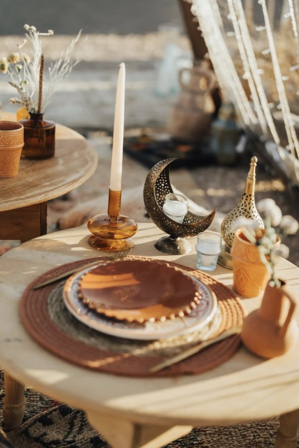 On reste dans l'idée de couleur mais cette fois avec une palette différentes. Des couleurs plus terreuses qui rappellent le sable ou encore la terre cuite. Ce sont des couleurs dans l'air du temps qui passent dans plusieurs types de déco (ce qui est chouette quand on aime recevoir et changer régulièrement de déco). Dans cette treizième inspiration, il y a aussi les accessoires qui font voyager: bougeoir en verre, photophores en métal ajourés, soliflore en terre cuite.