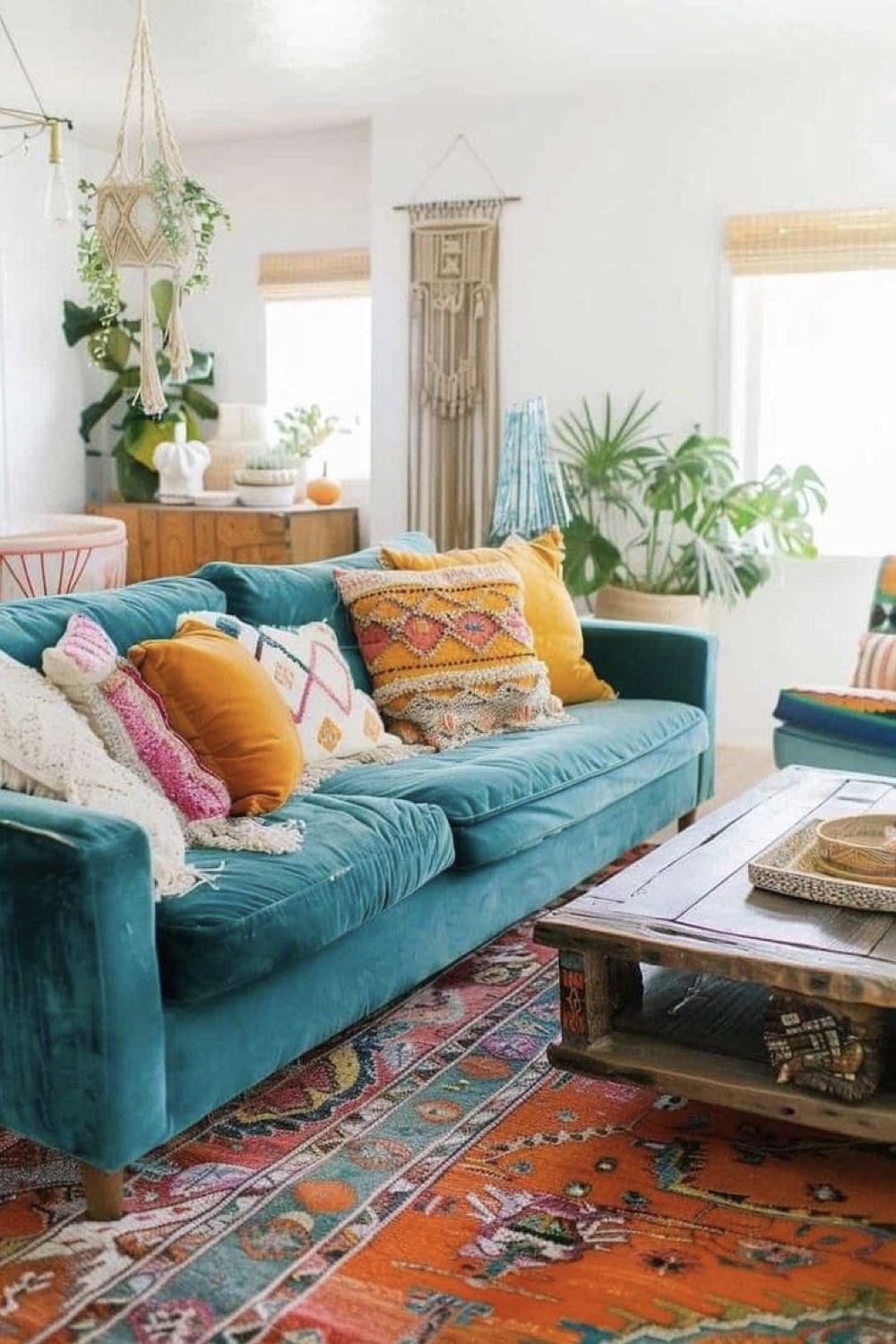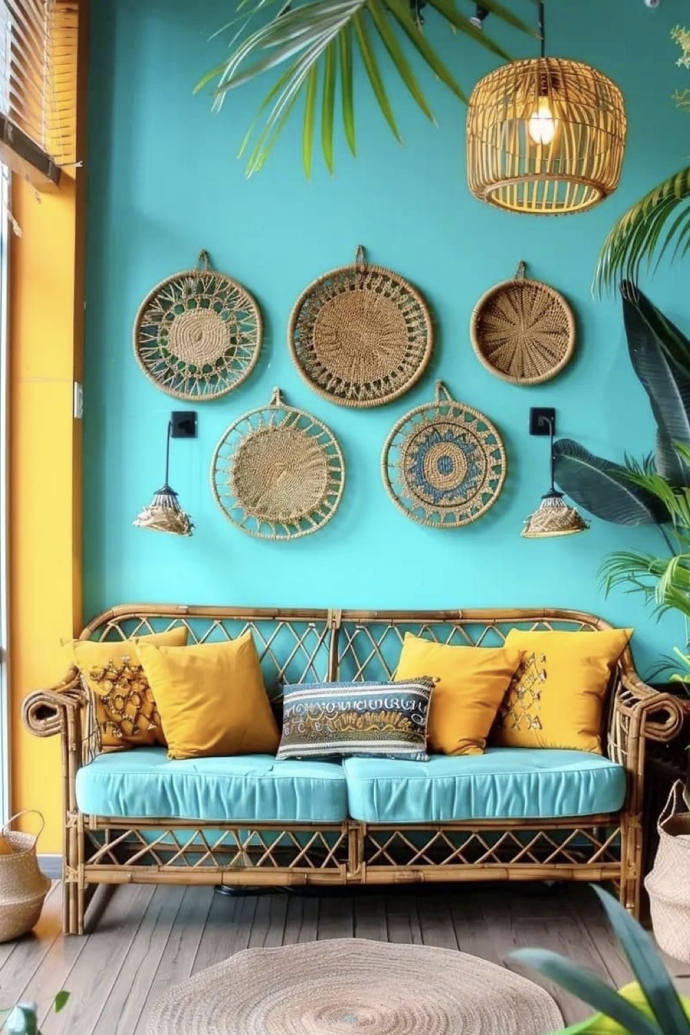 Les matériaux peuvent aussi vous aider à réchauffer une pièce bleue lagon. Et comme c'est une couleur naturelle, il est assez évident d'utiliser des matériaux eux-aussi naturels. Le bois est un grand classique quand on souhaite réchauffer une ambiance. Mais on peut également piocher dans les fibres végétales: osier, bambou, jonc de mer, jute... Et si les intérieurs bohèmes vous ont toujours plu, vous pouvez aussi utiliser le macramé pour personnaliser votre décoration murale.