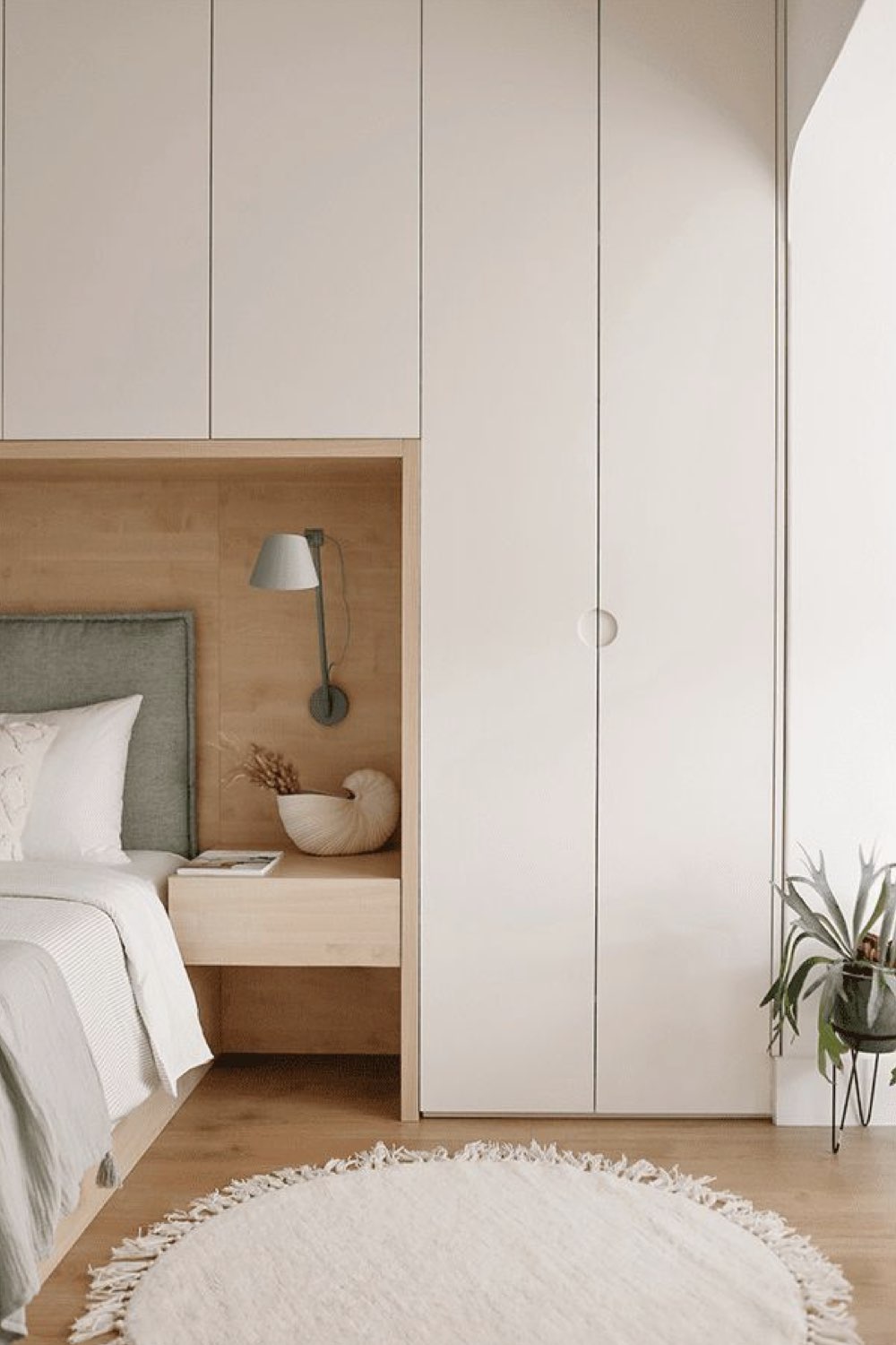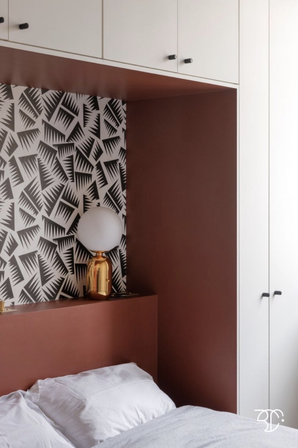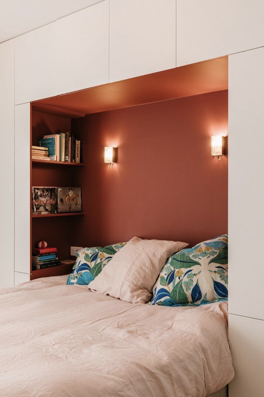 Autre petit plus qu'il est possible d'intégrer dans votre aménagement: une niche pour remplacer la table de nuit ou pour un appoint de rangement. Je pense notamment aux passionné•e•s de lecture qui ont toujours des PAL sur la table de nuit. Une niche avec plusieurs étagères permet de ranger les livres facilement.