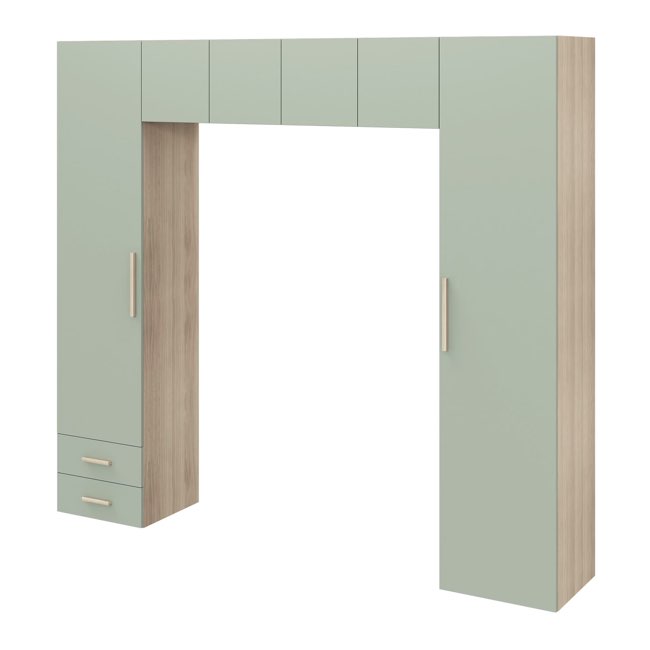 Si on regarde de plus près les deux colonnes de chaque côté du lit, on peut trouver un ou plusieurs espaces penderie (à hauteur de bras). On trouve aussi des caissons en bas près du sol et en haut près du plafond. Près du sol, vous pouvez intégrer des tiroirs. En revanche près du plafond, il est préférable de choisir des caissons avec des portes et à l'intérieur des étagères pour ranger ce qui ne sert pas tous les jours (linge de lit par exemple). Parfois dans ces colonnes, côté intérieur, il y a des étagères voire des niches. Une alternative à la table de nuit.