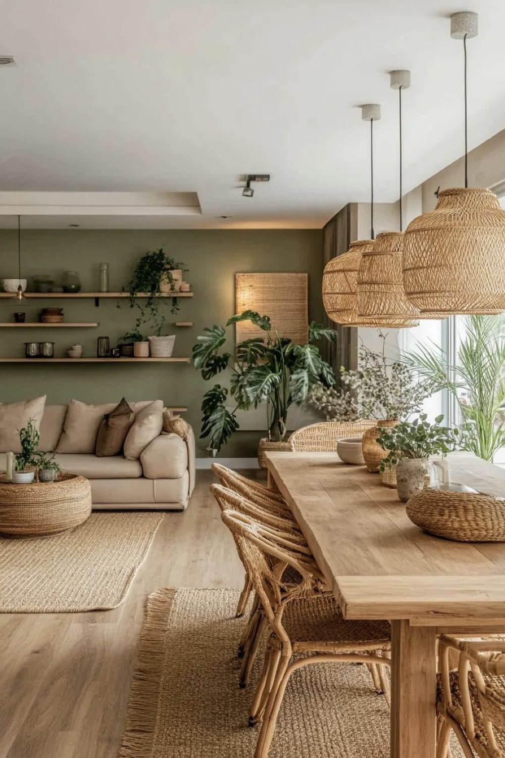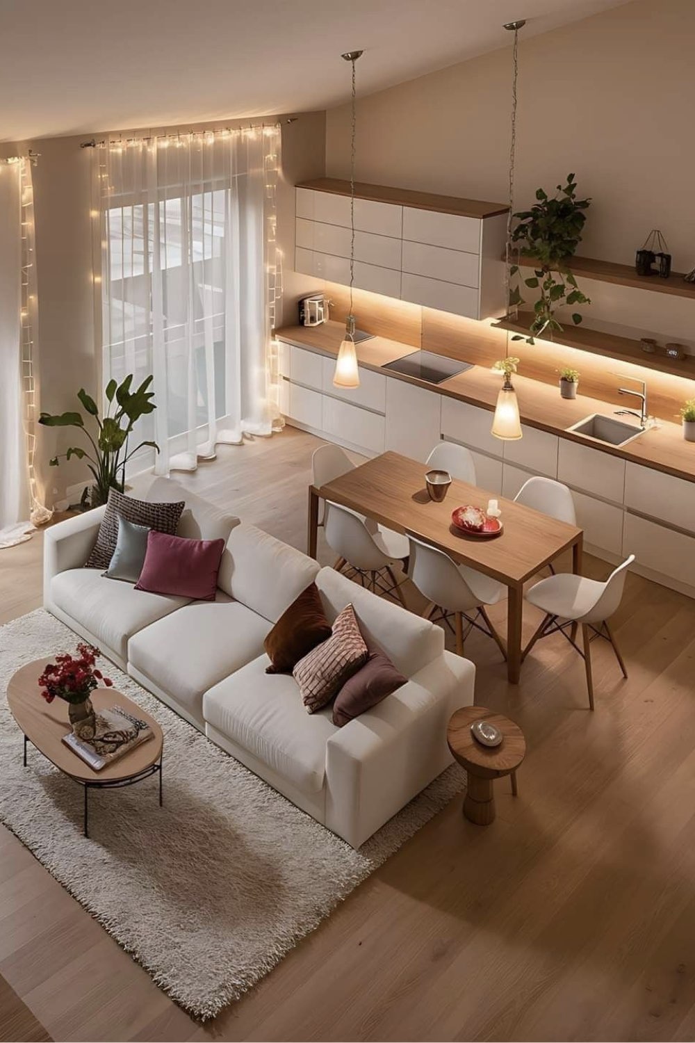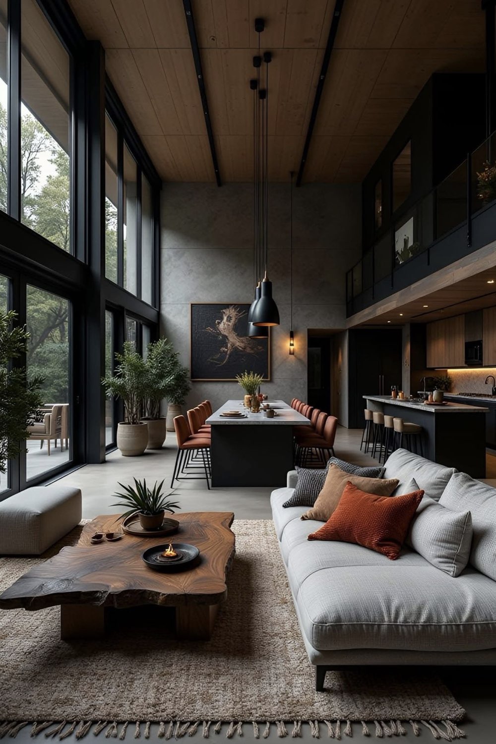 Harmonie des couleurs et des matériaux dans un salon salle à manger ouvert