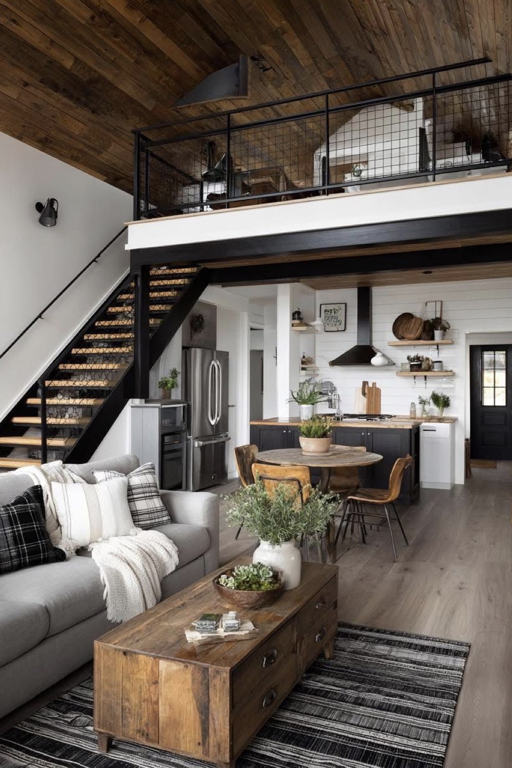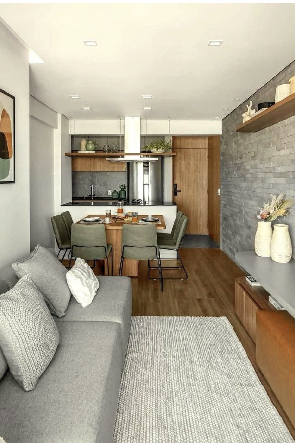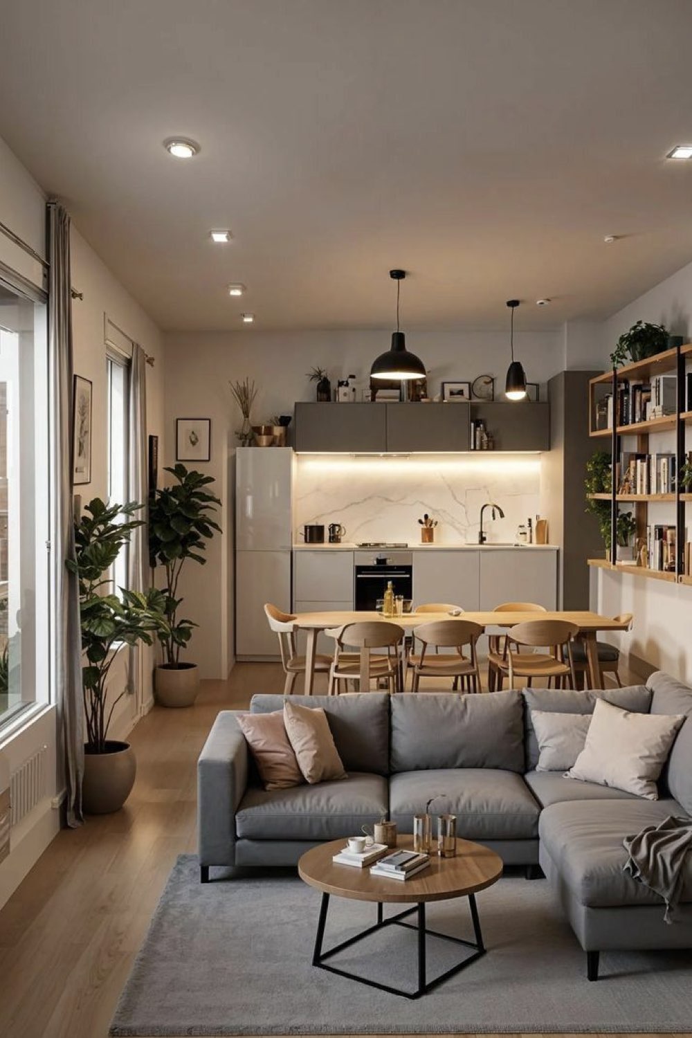 Harmonie des couleurs et des matériaux dans un salon salle à manger ouvert