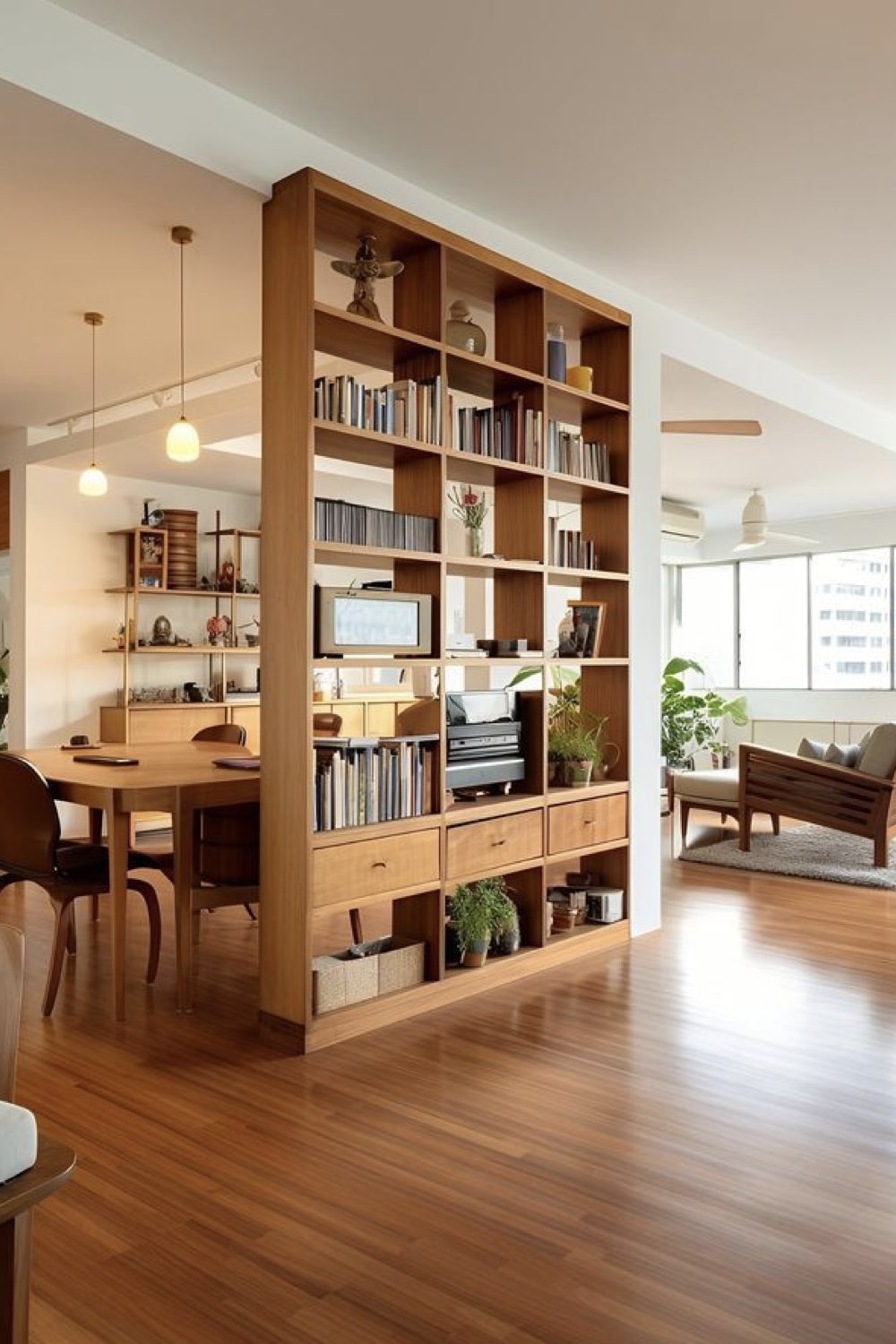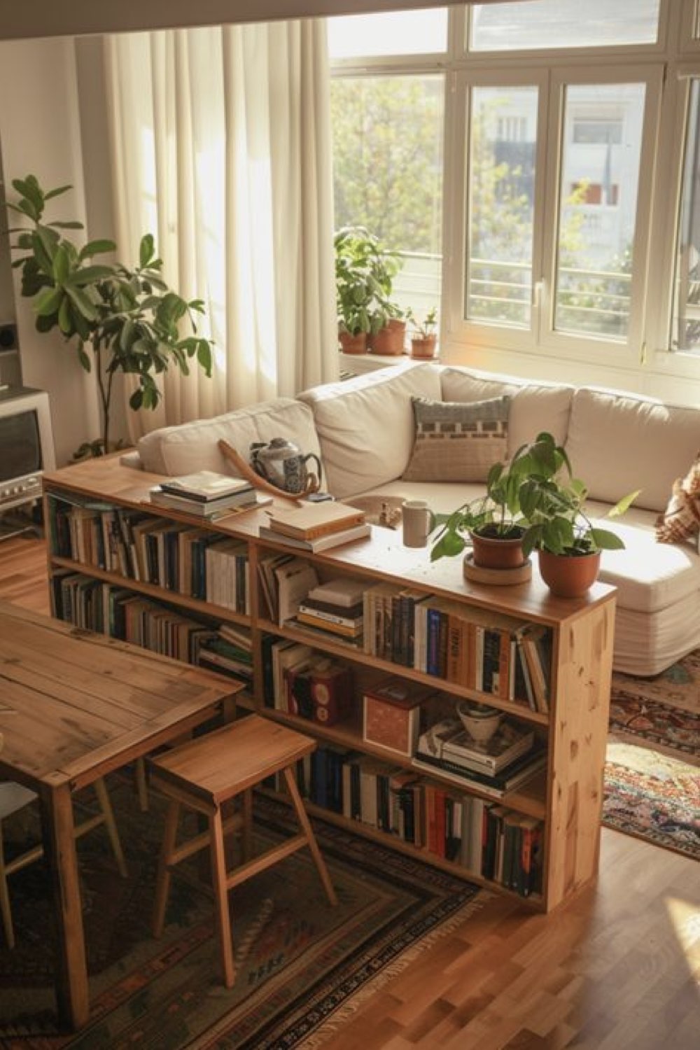 On peut par exemple penser à installer une bibliothèque pour structurer la pièce. Elle peut être ouverte sur les deux espaces. Elle peut aussi laisser voir ce qui se passe d'un côté et de l'autre dans le cas où elle ne déborde pas de livres. Cette bibliothèque peut être un meuble acheté dans le commerce où un meuble sur-mesure. Dans ce dernier cas, les possibilités sont nombreuses et on peut faire monter le meuble jusqu'au plafond.