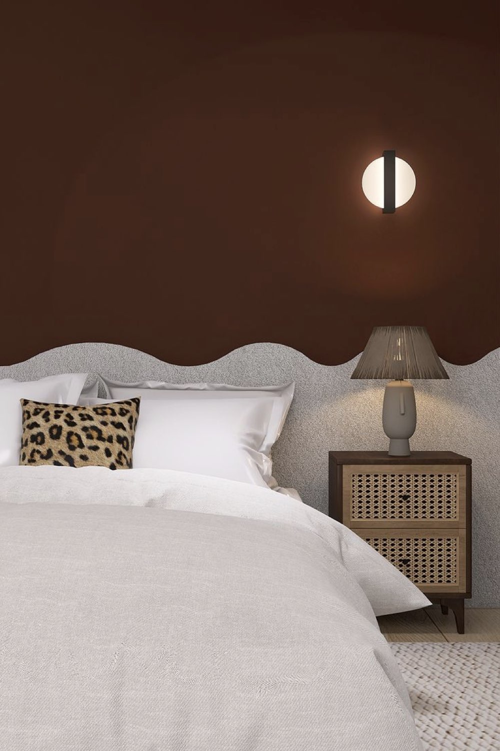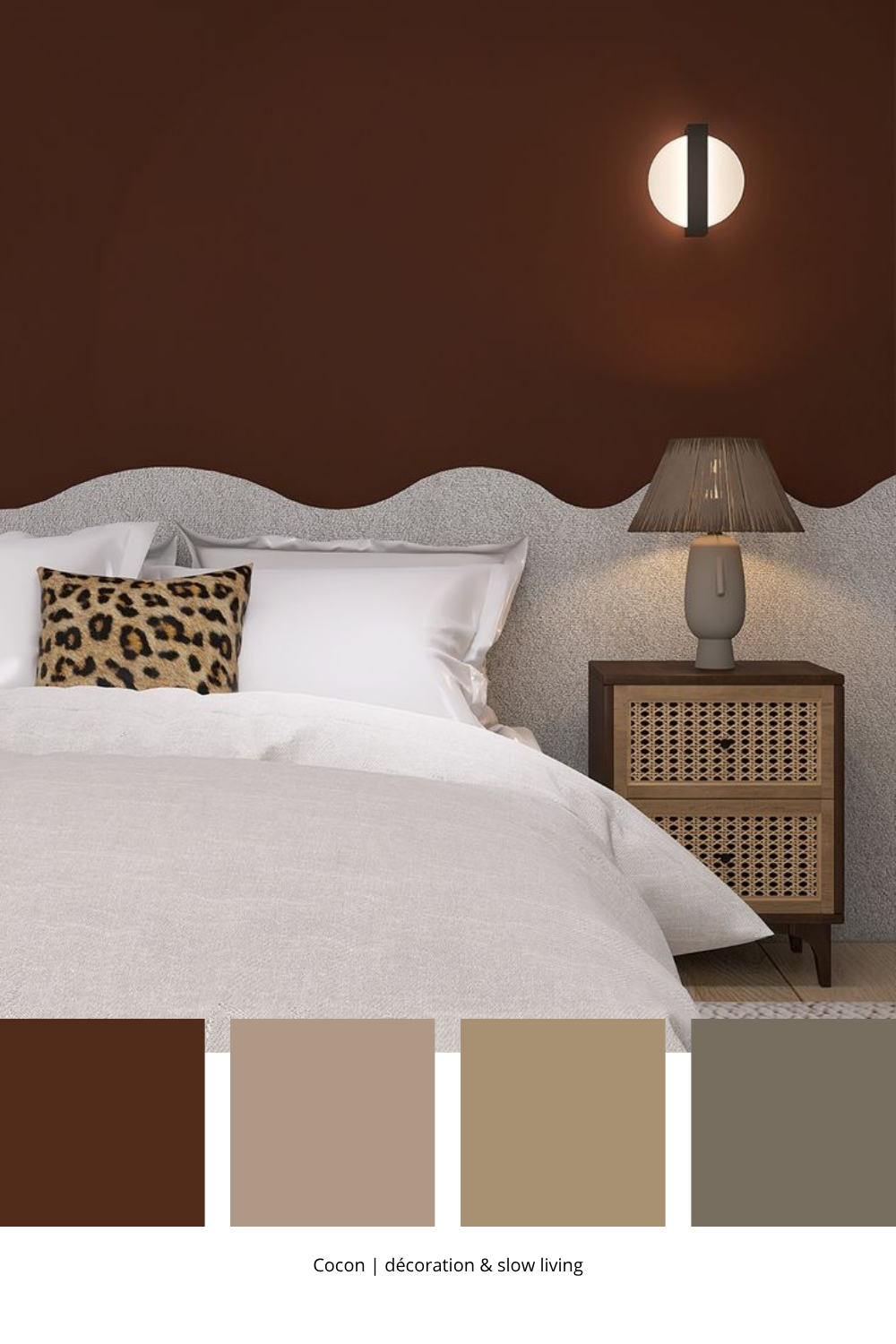 Pour ce premier exemple, l'équilibre passe par l'utilisation de couleurs neutres. On a un soubassement qui crée un effet "vague" qui est gris chiné. Le linge de lit quant à lui est blanc. Il n'est pas sans rappeler les parures de lit que l'on trouve en hôtel. Une forme de luxe, sans aucun doute. Toujours dans l'idée de neutralité, on peut regarder la lampe de chevet greige), le cannage de la table de nuit, la descente de lit. Et puis il y a le coussin léopard, une touche qui conforte le côté moderne et original de la déco.