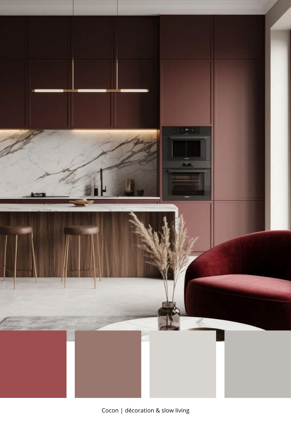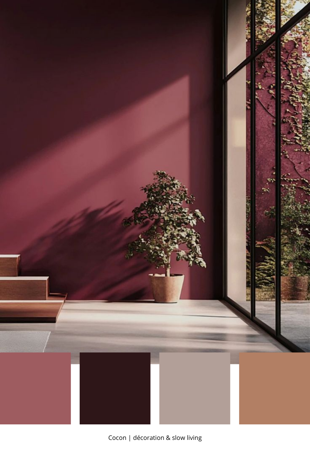 Le bordeaux est une couleur qui revient sur le devant de la scène déco. Elle fait partie de la famille des couleurs sourdes qui sont parfaites pour créer une déco intérieure élégante et intime.